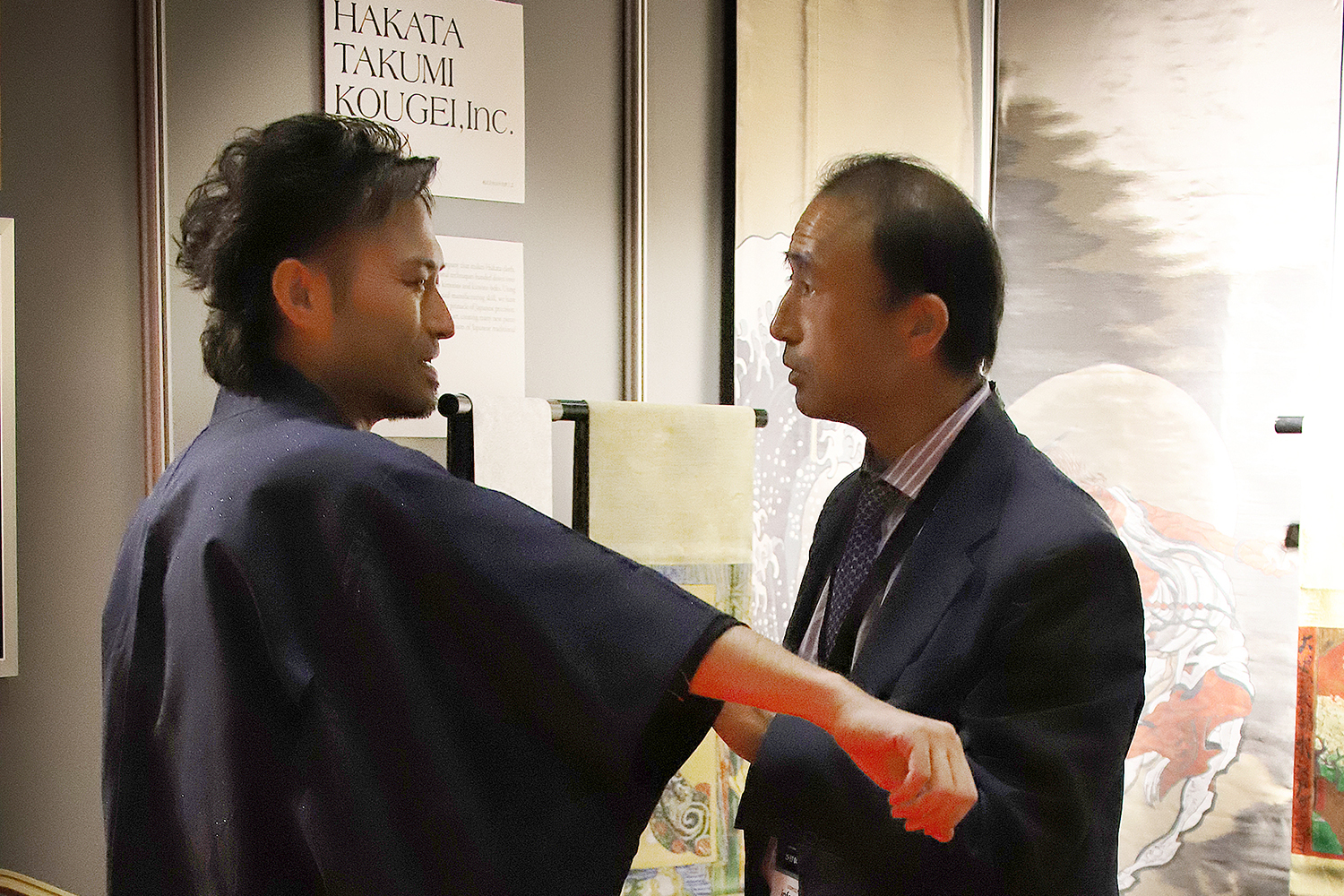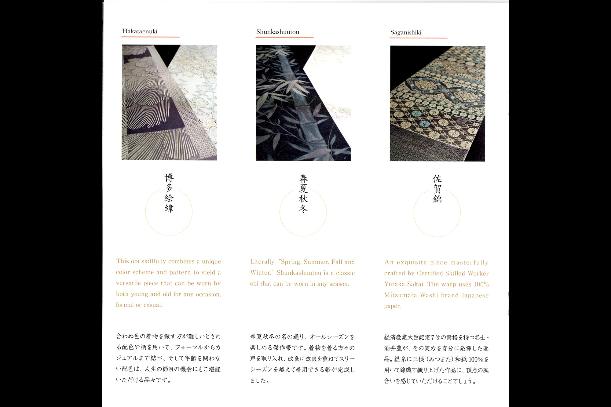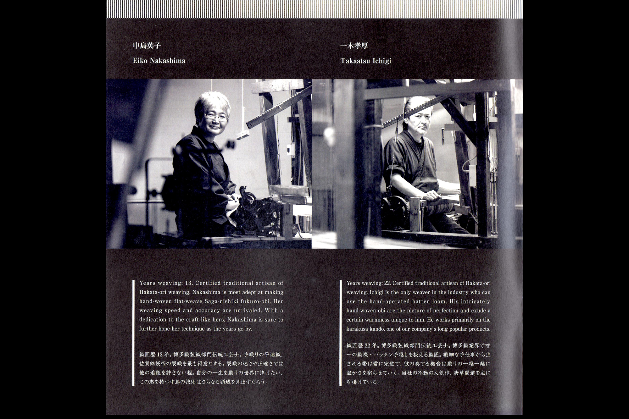 2018年11月よりロンドンのVictoria & Albert Museumでの展示も始まります。最近では一般社団法人萌生堂の浮世絵工房さんとのコラボ作品や、武人画師こうじょう雅之氏の水墨画「武人画」を博多織で織り成して表現したアート作品なども制作し、伝統を未来へ残す為チャレンジをし続けています。