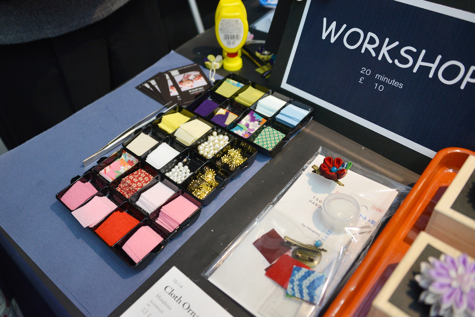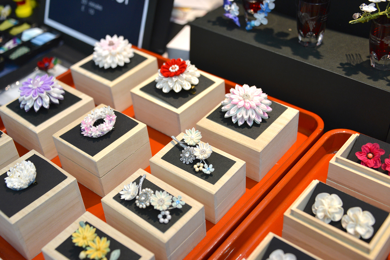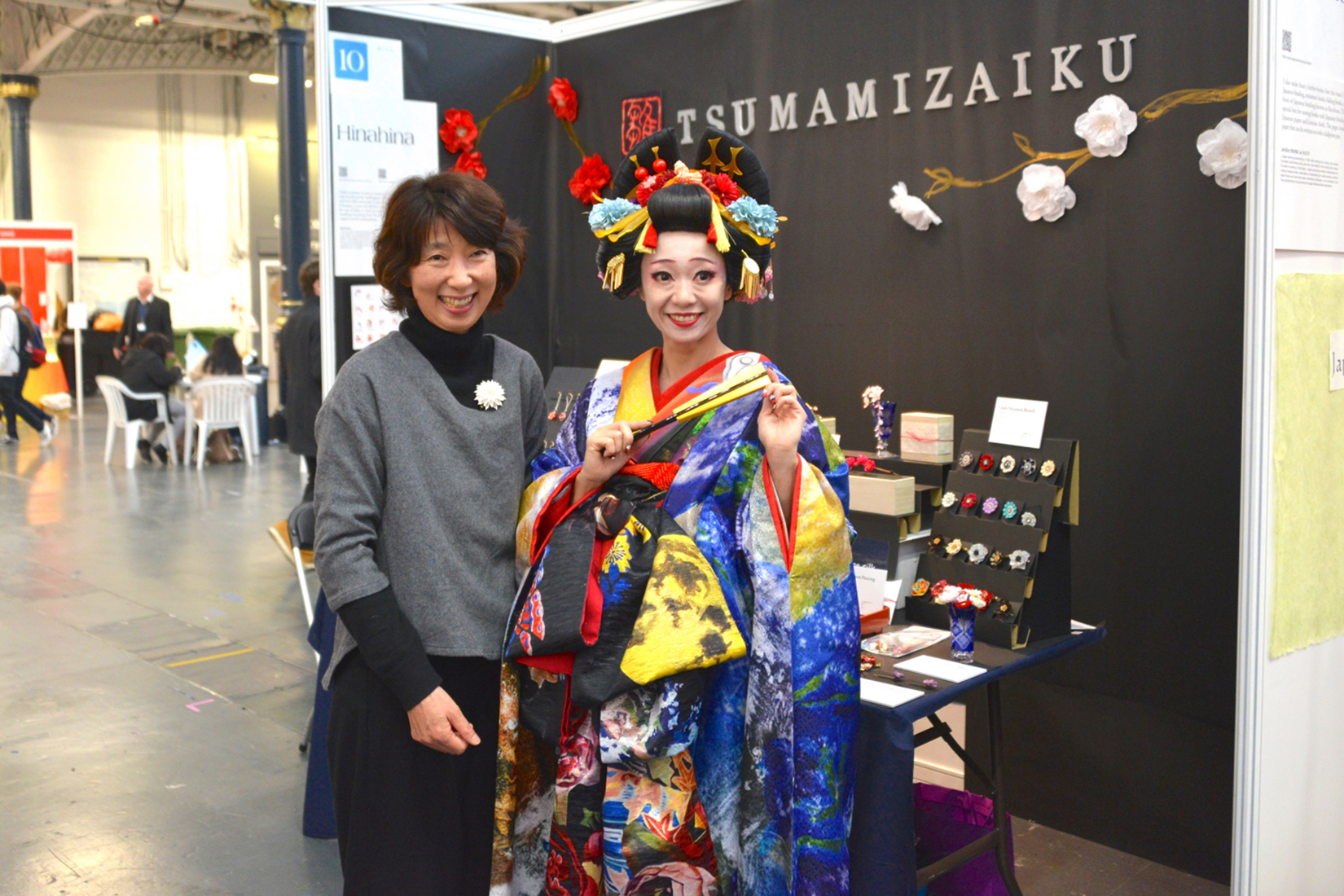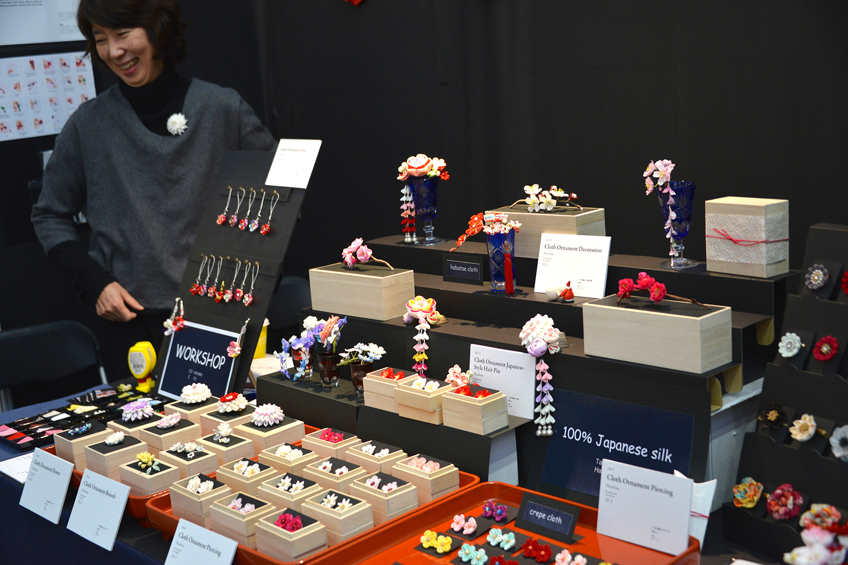 秋田県の手作りのつまみ細工店。写真を見て頂くと分かるようにつまみ細工作家の林聖子さんによって、1つ1つ丁寧に作られた、美しく繊細な作品である。デザインも全てオリジナルであり、ブローチから髪飾り、様々な形で使うことができる。雛hinaの作家活動を2013年より始め、パリでの活動のほか、「日本つまみ細工コンテスト 夏」ではフォトジェニック賞を受賞し、今回のハイパージャパンへの参加となった。ブーツにはつまみ細工を知らない一般の人のためのワークショップも設けられていた。