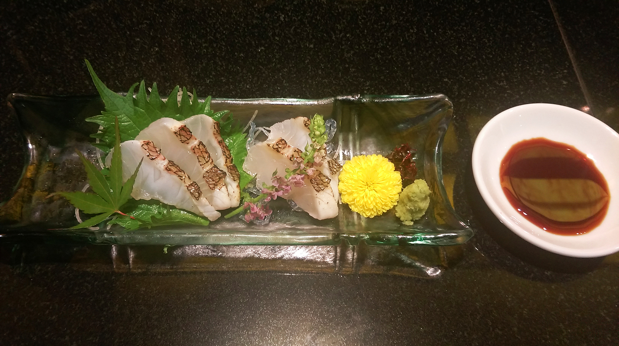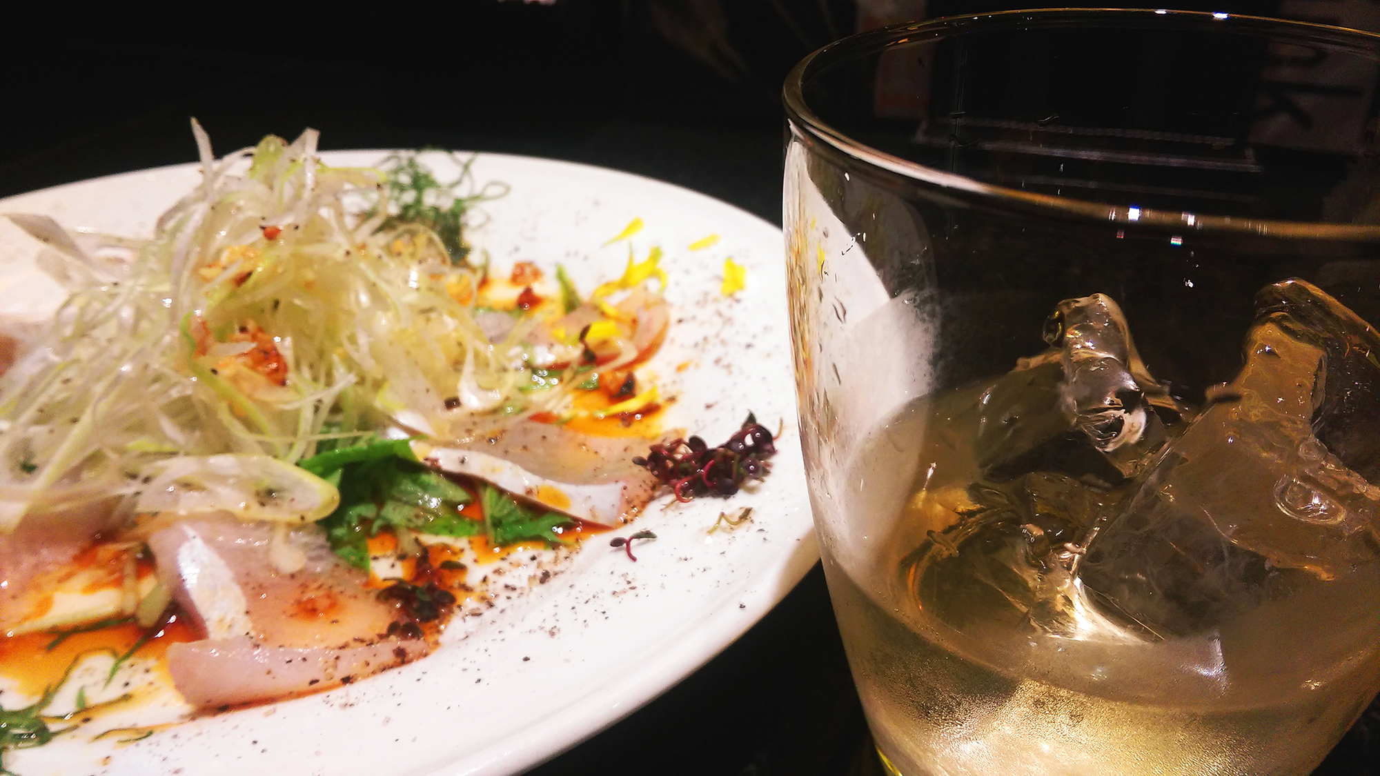 さて、パッションフルーツ酒を頂きまして、最後の〆は「かんぱちカルパッチョ」と「山崎シングルロック」に致しました♪