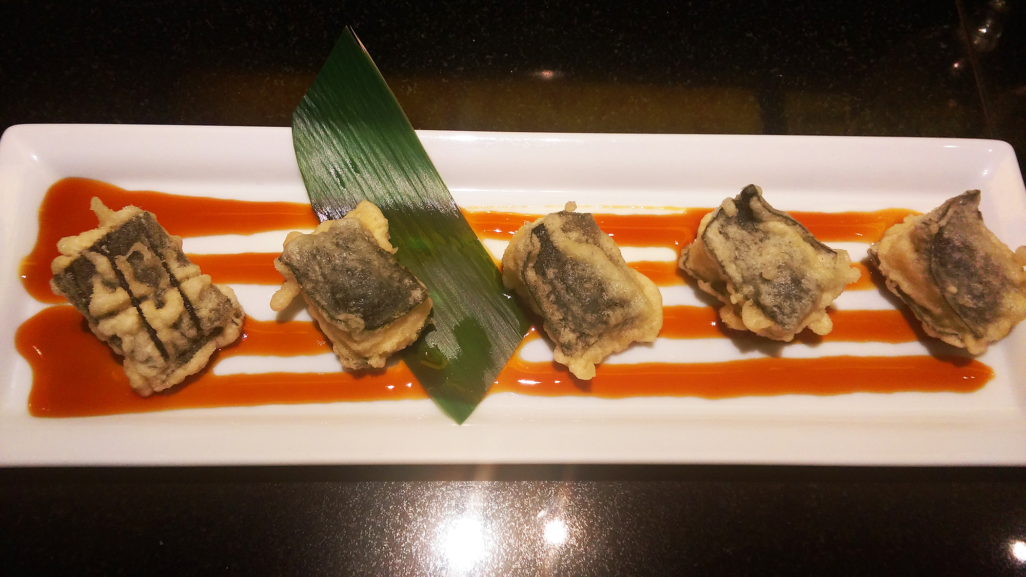 まずは被災地応援も兼ねて、熊本清酒「朱盃」と真鯛のお刺身を注文致しました☆(上はお通しの白身魚のフリットタルタル添えと朱盃♪)