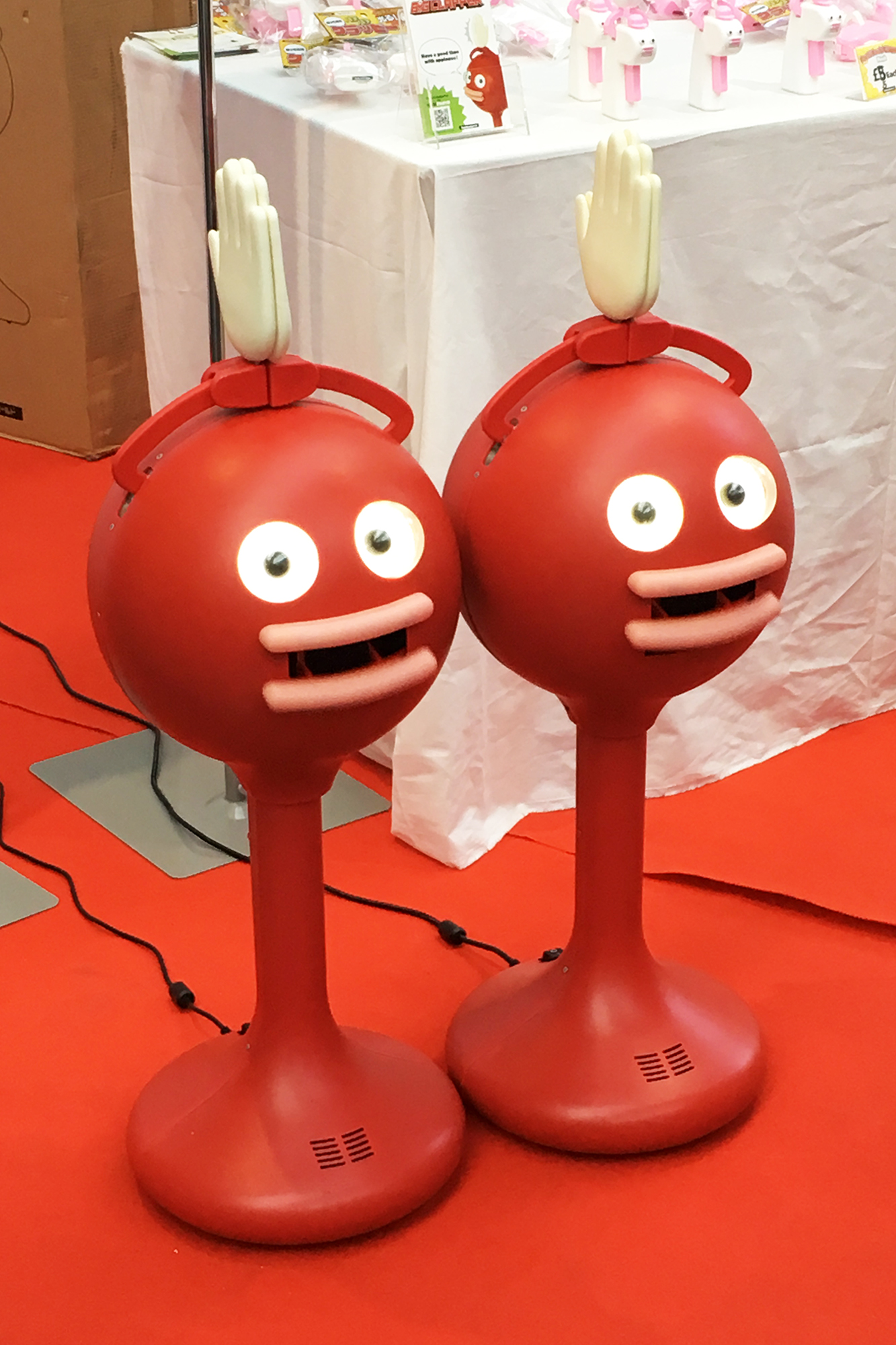 ・バイバイワールド株式会社が贈る、盛り上げ拍手ロボット”Big Clappy”!どこから見てもこちらを見ている…!(様な気がする(笑))奇妙な彼が、拍手して合いの手打って、気分が落ち込んでる時も、勝手に(笑)盛り上げてくれます!「しゃーないなぁ~」とつい顔がほころんでしまうこと間違いなし!?