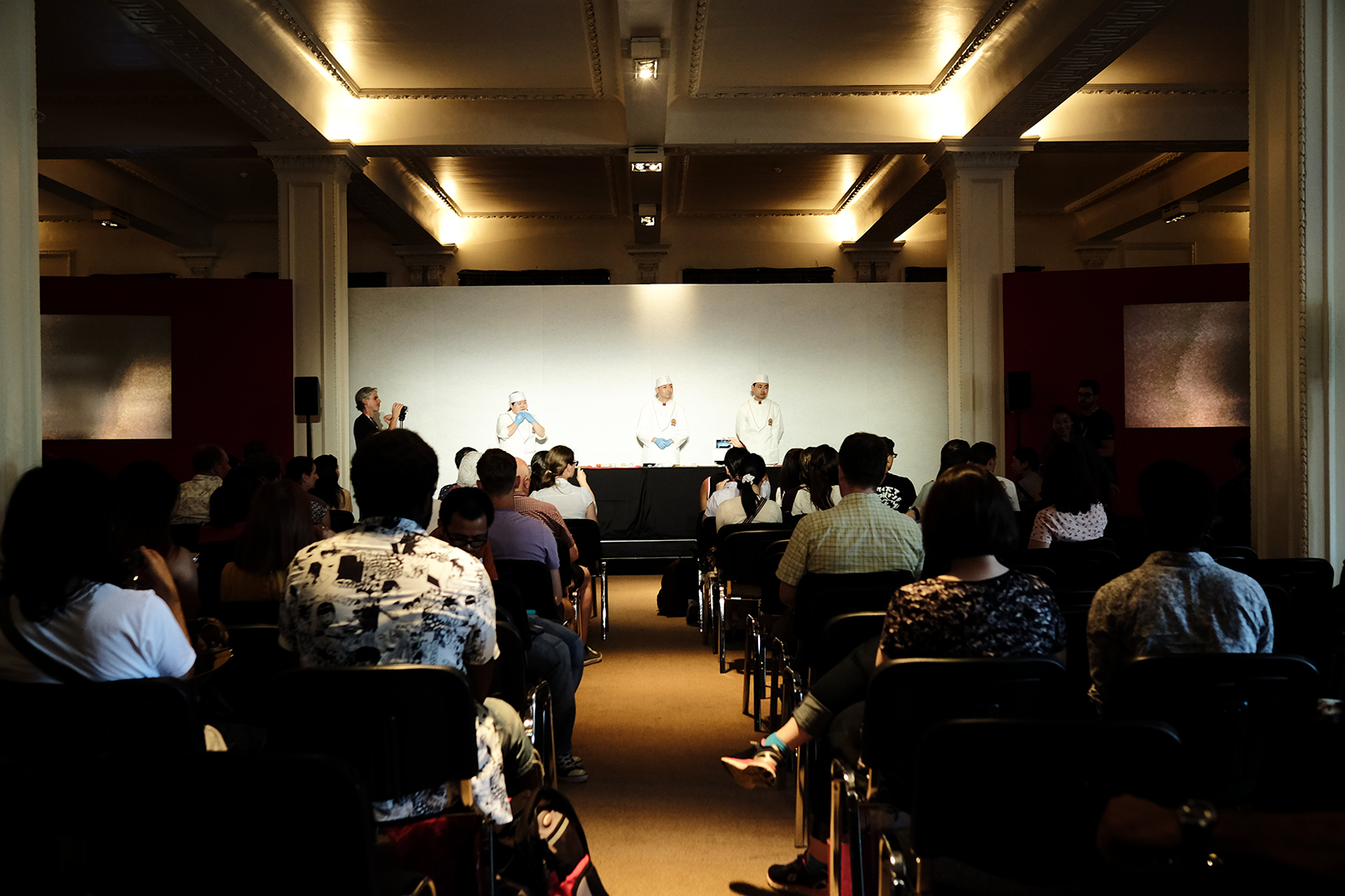 ・この日の最後は講演会場HYPER Theatreで行われた、和菓子作りの実演を拝見致しました。実演・講演をされるのは千住に工場がある有限会社喜田屋の中西さんら3名の職人さん。菓子技能検定(和菓子と洋菓子と別れている)に合格した日本全国でも200数名しかいないうちの3名にお越しいただいたとの事。限られた時間の中で、まずは中西さんは寒椿~雪うさぎと作っていかれます。他の方も青楓と桃の花を作っていかれます。