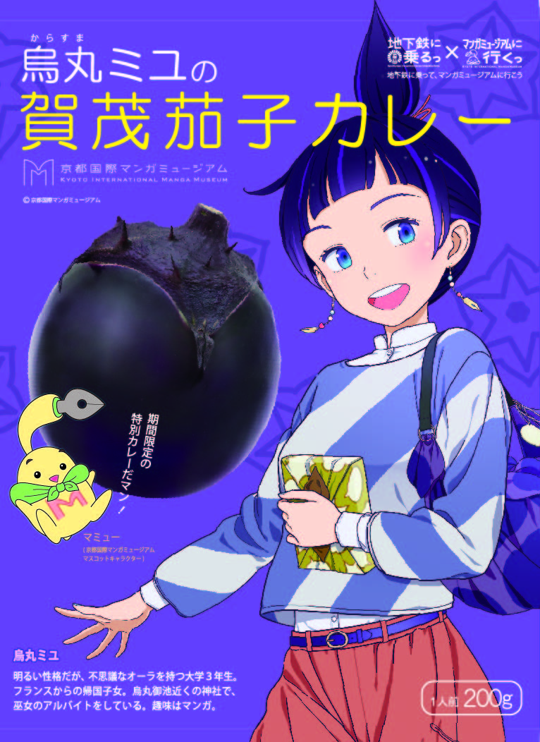京まふ2018より、祖父の神社でお手伝いをしている巫女姿の烏丸ミユが新登場し、オリジナルグッズ「烏丸ミユの賀茂茄子カレー」も館内ミュージアムショップにて好評新発売!