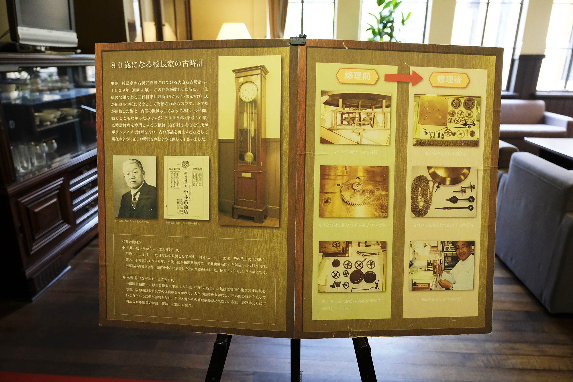 館内にはその当時の佇まいの数々がそのまま残されており、漫画の沢山ある”漫画小学校”にいるかのように、誰でも童心に帰ることが出来、とても細部にまで風情があり感慨を覚えます。その例として、そのまま残された校長室や守衛室表札、講堂。2階へ登れば、龍池歴史記念室や渡り廊下、これらの窓から生徒たちは校庭を眺めたのかな。と子供達の笑顔の情景が浮かびます。
