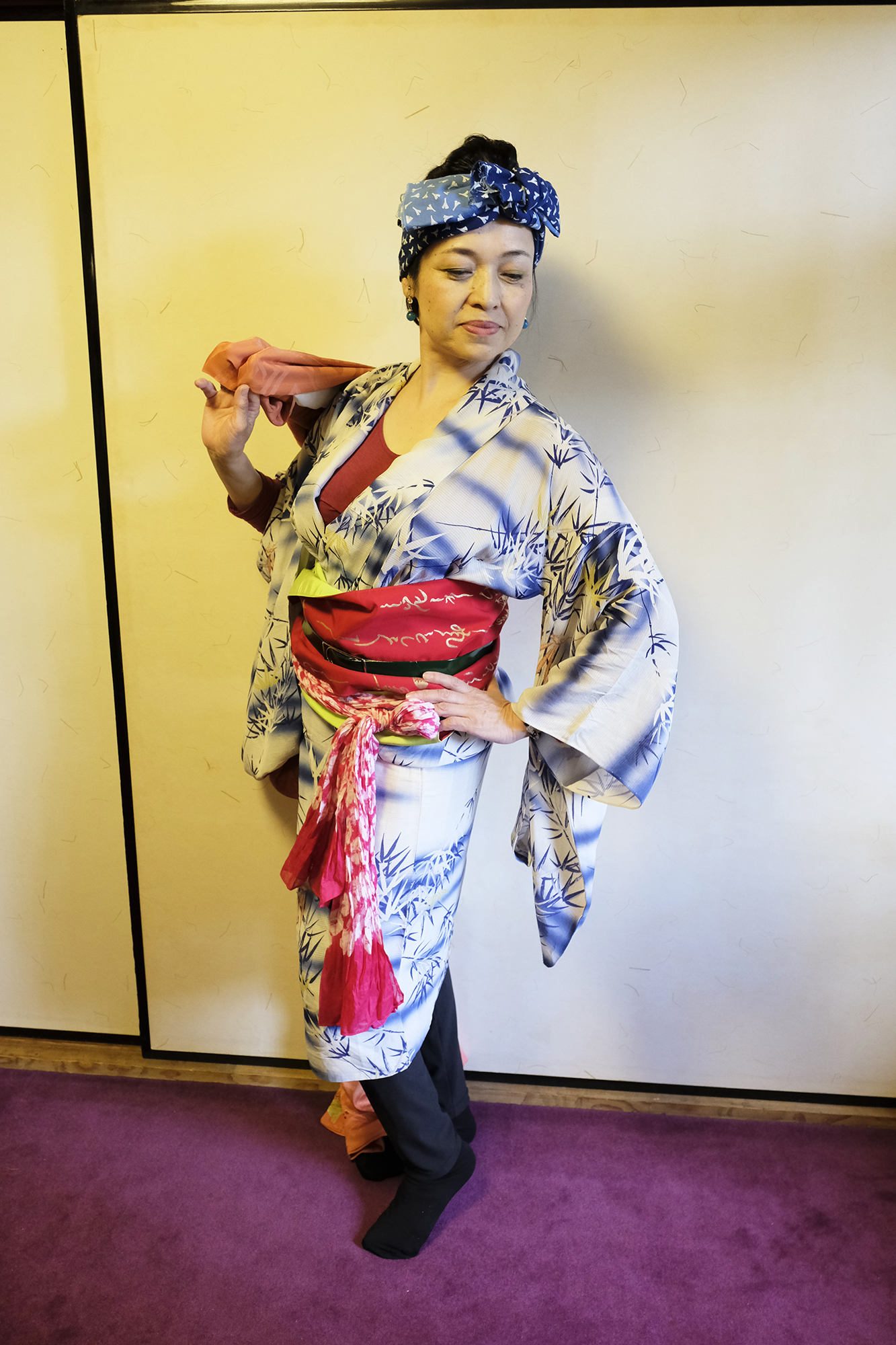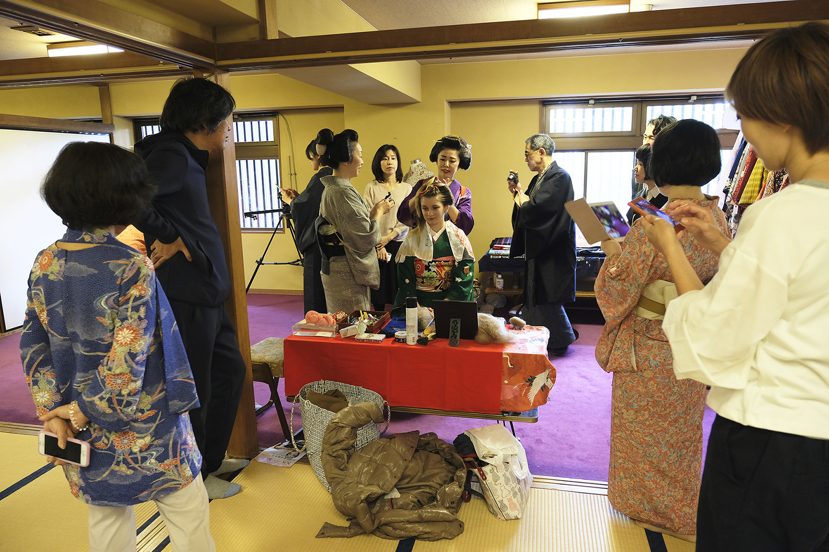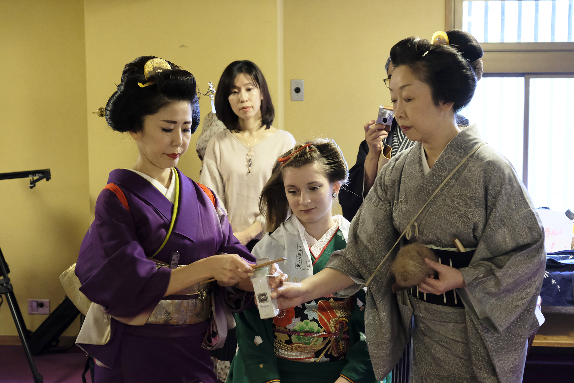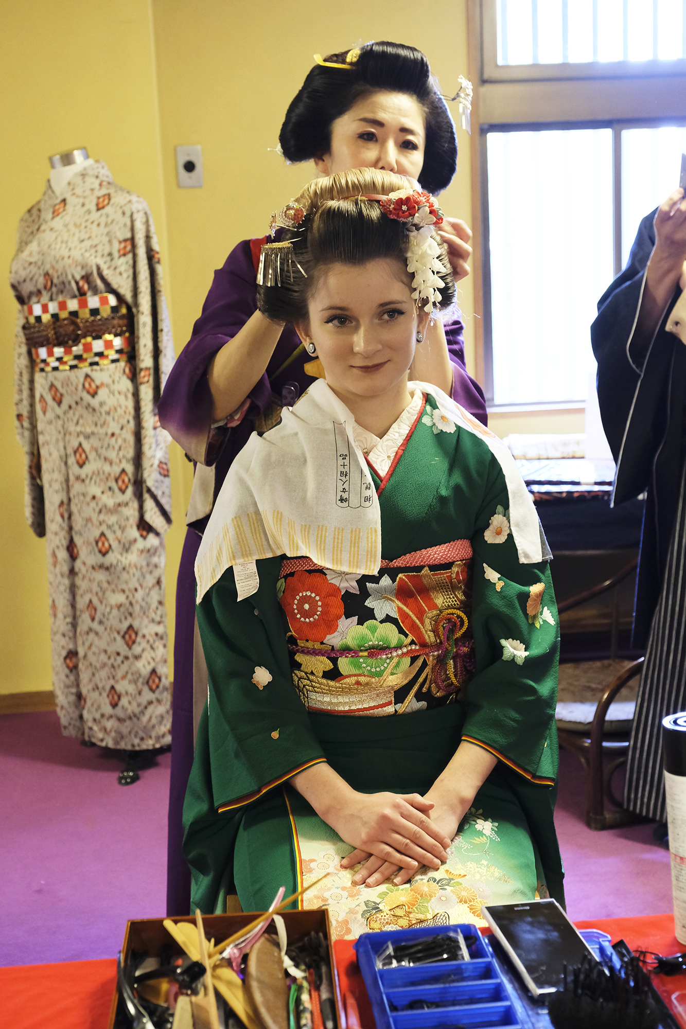 何回か体験してくれている可愛らしいドイツ人女性の方が、今日もモデルさんとの事でした。洋服姿も見てしまうと、お着物を着た時の美しさのギャップがまた素敵ですね!お着物を着てパフォーマンスの準備を整えています。