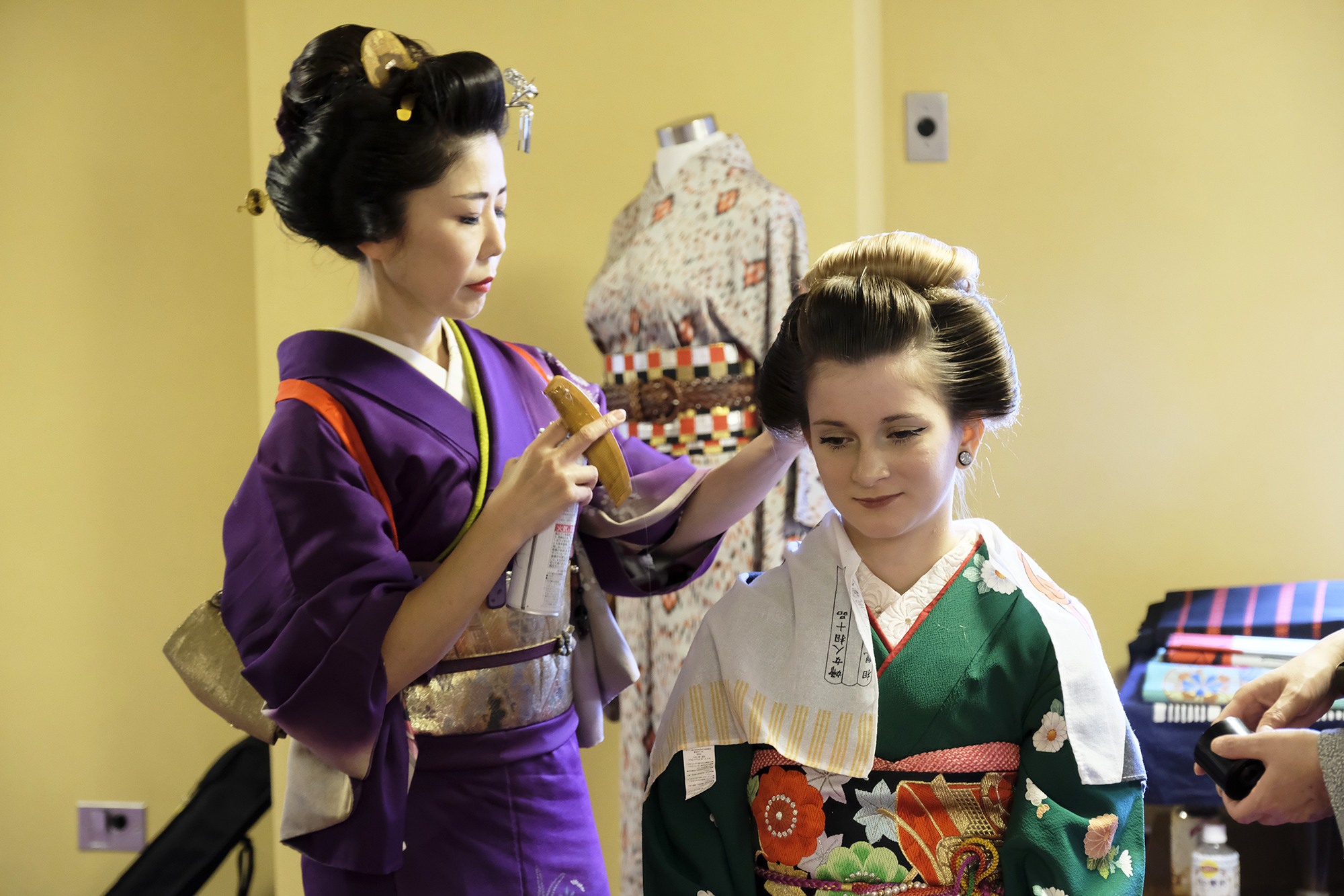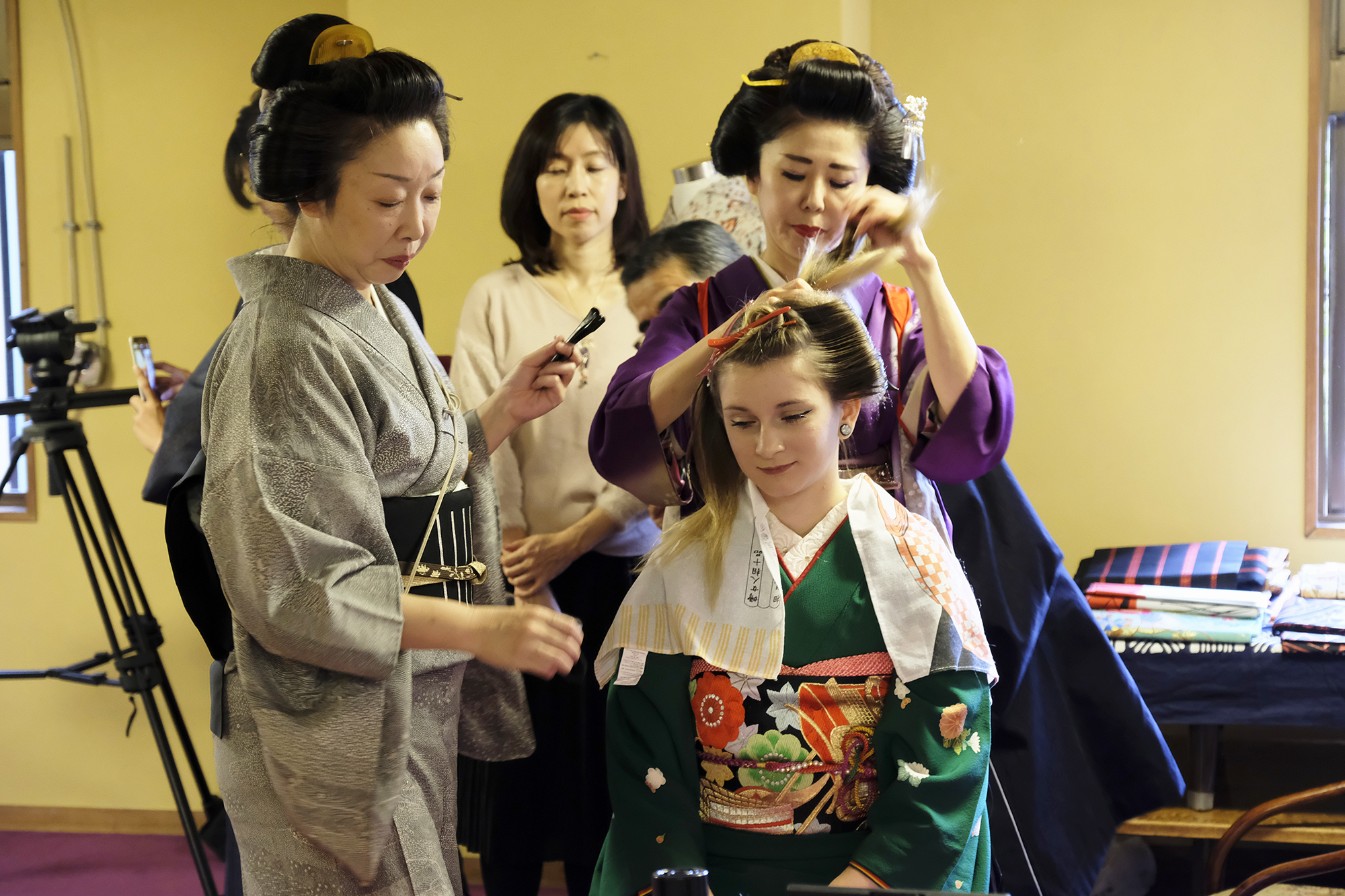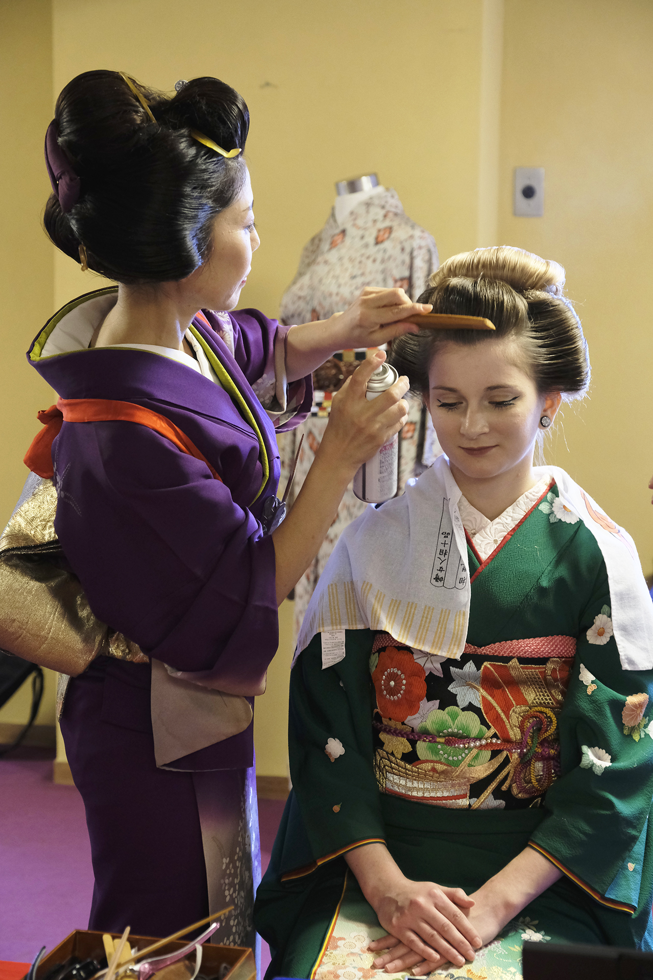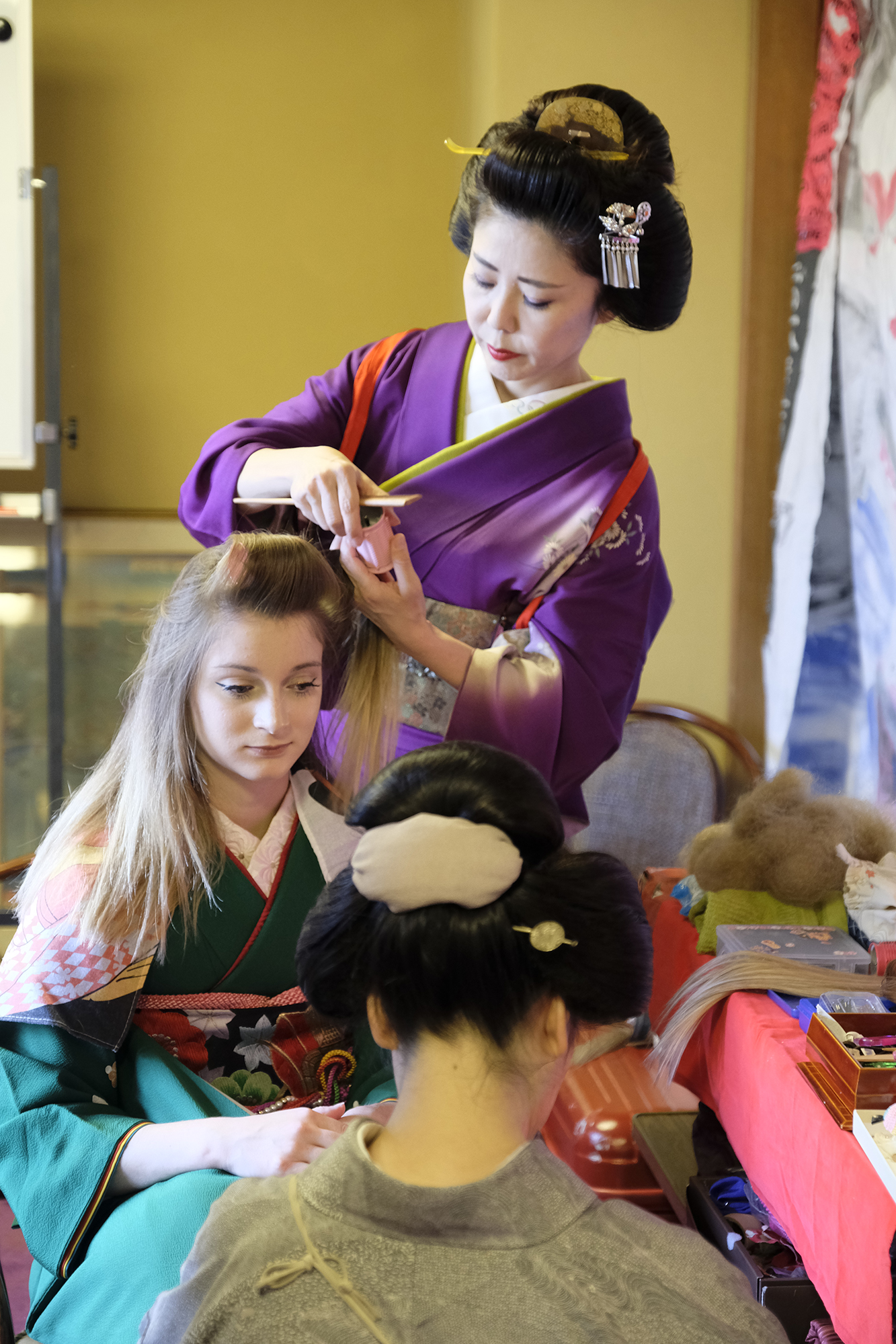 何回か体験してくれている可愛らしいドイツ人女性の方が、今日もモデルさんとの事でした。洋服姿も見てしまうと、お着物を着た時の美しさのギャップがまた素敵ですね!お着物を着てパフォーマンスの準備を整えています。