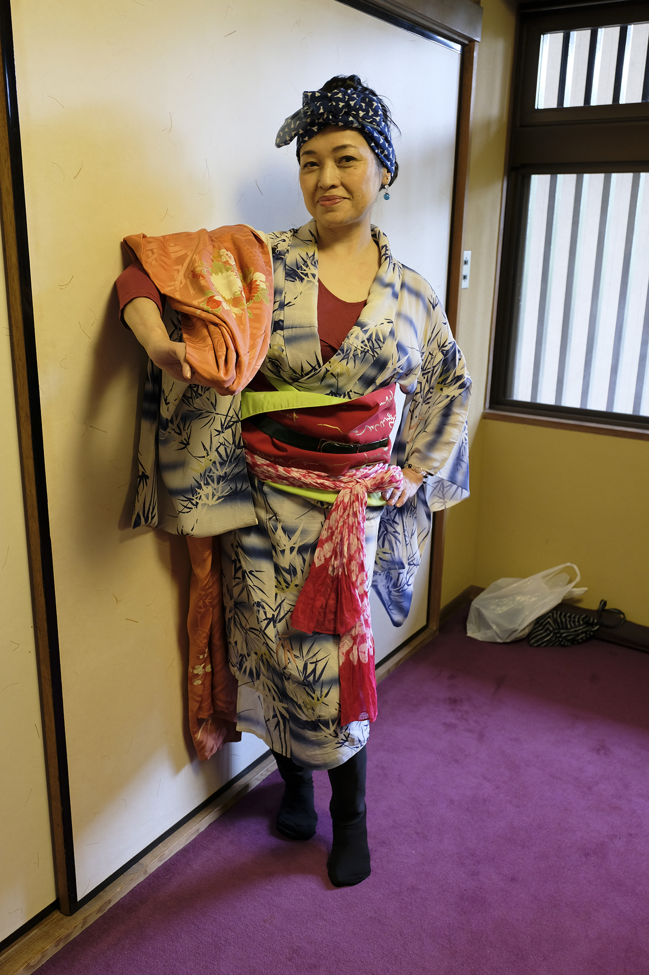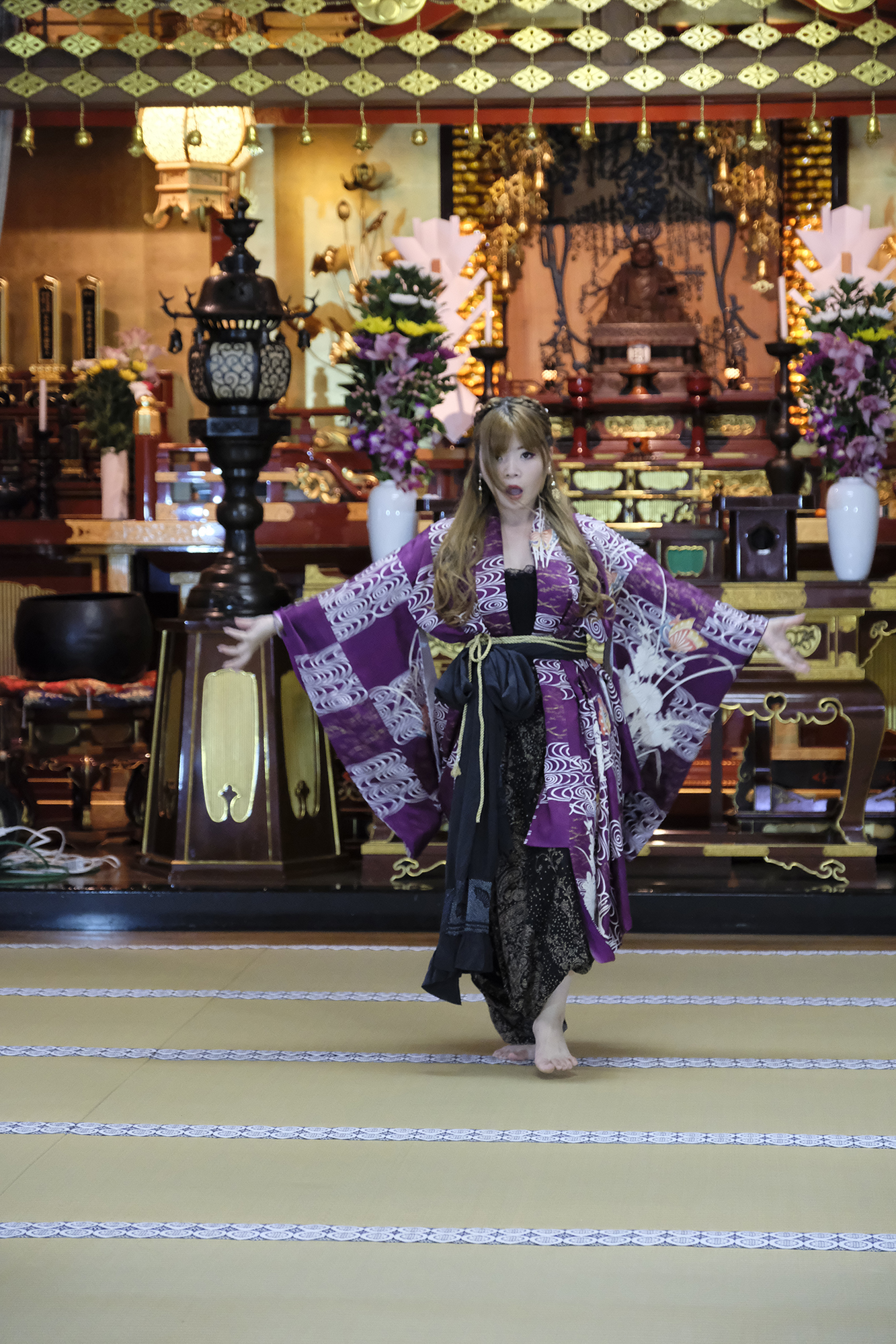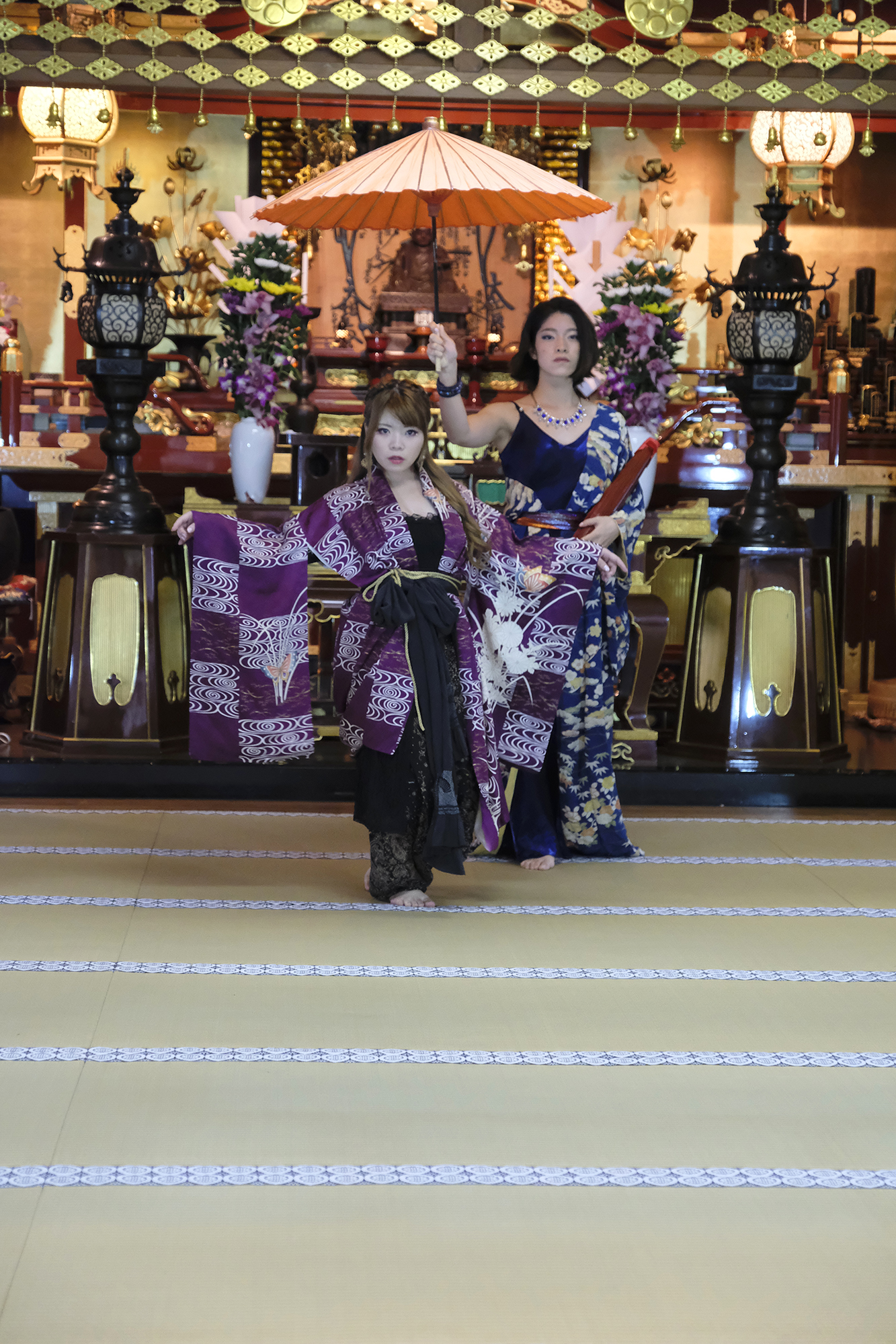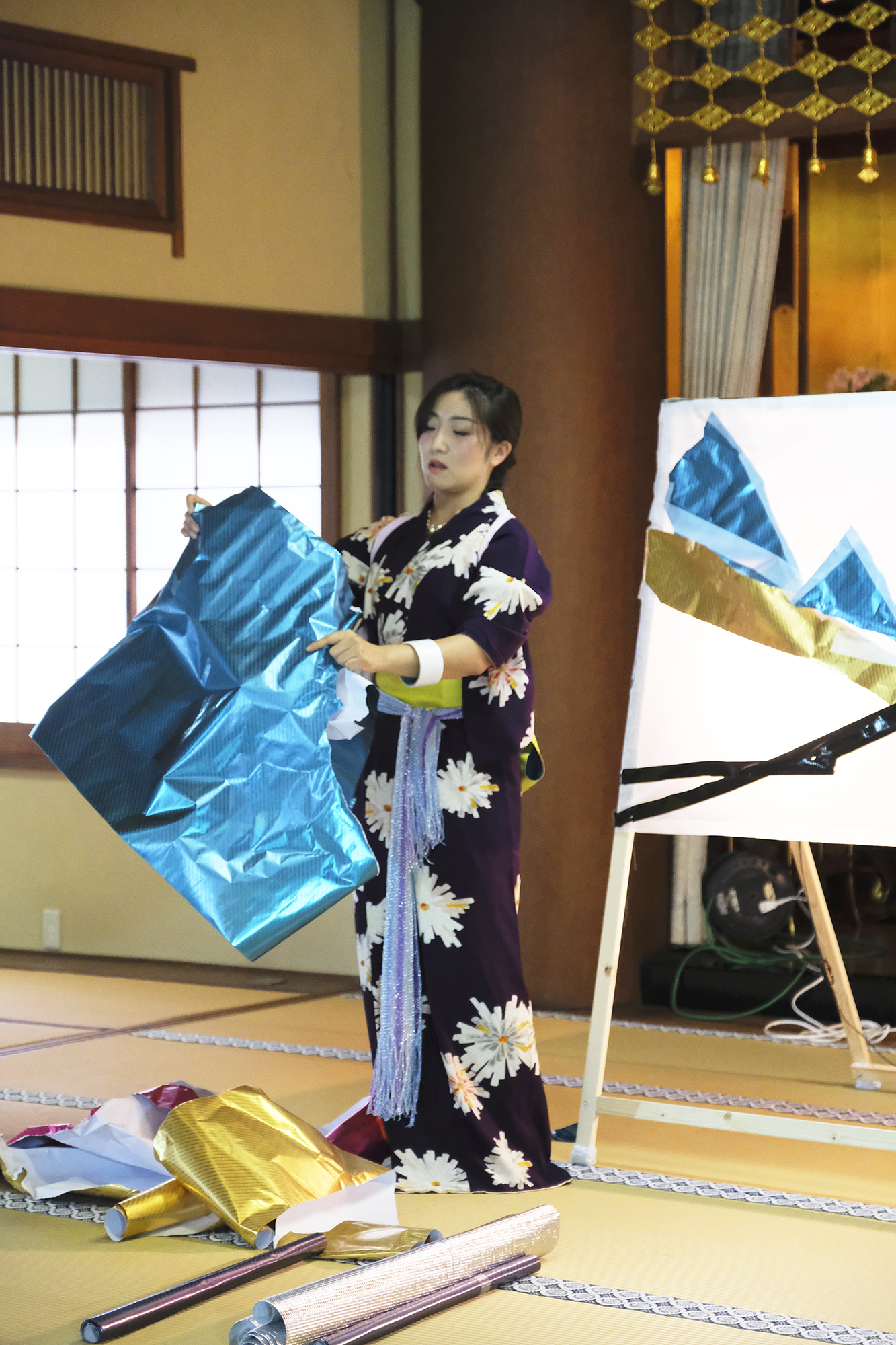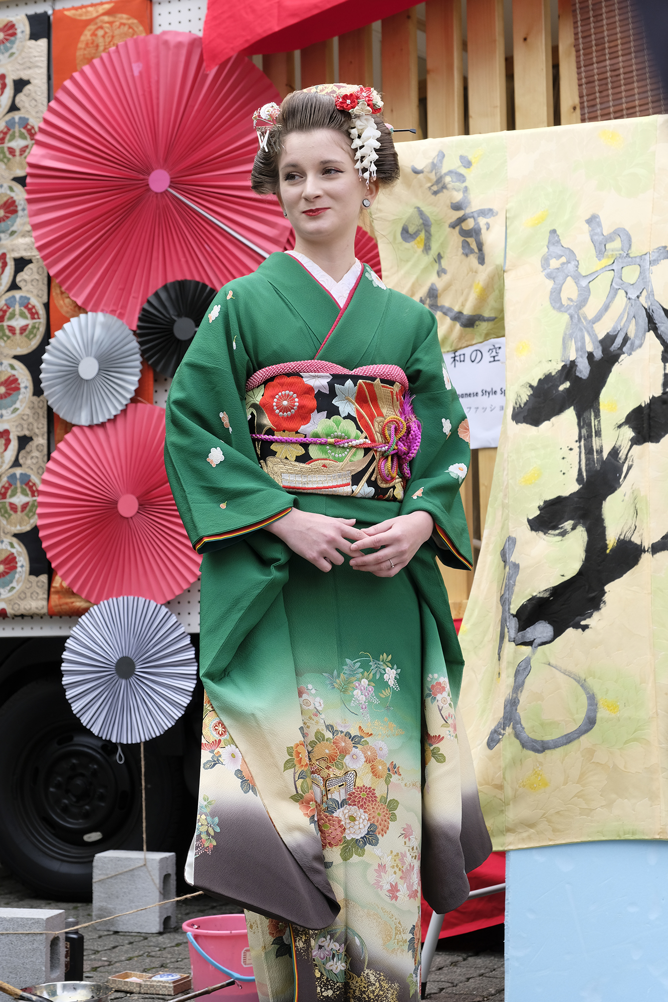 何回か体験してくれている可愛らしいドイツ人女性の方が、今日もモデルさんとの事でした。洋服姿も見てしまうと、お着物を着た時の美しさのギャップがまた素敵ですね!お着物を着てパフォーマンスの準備を整えています。