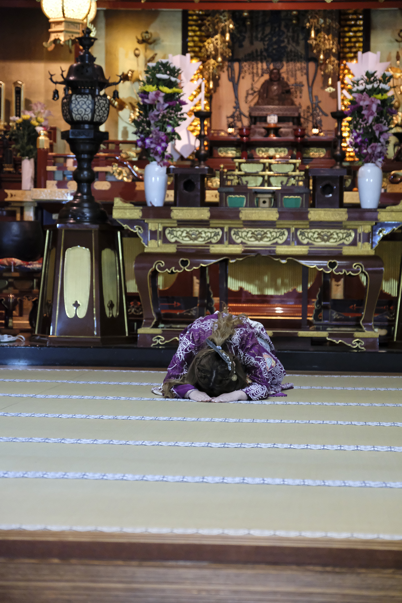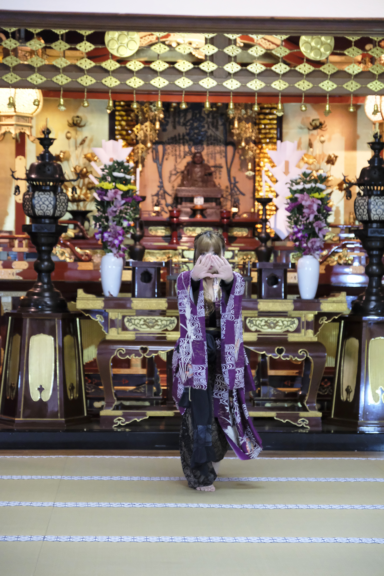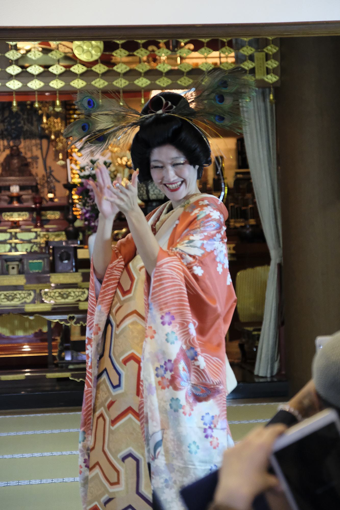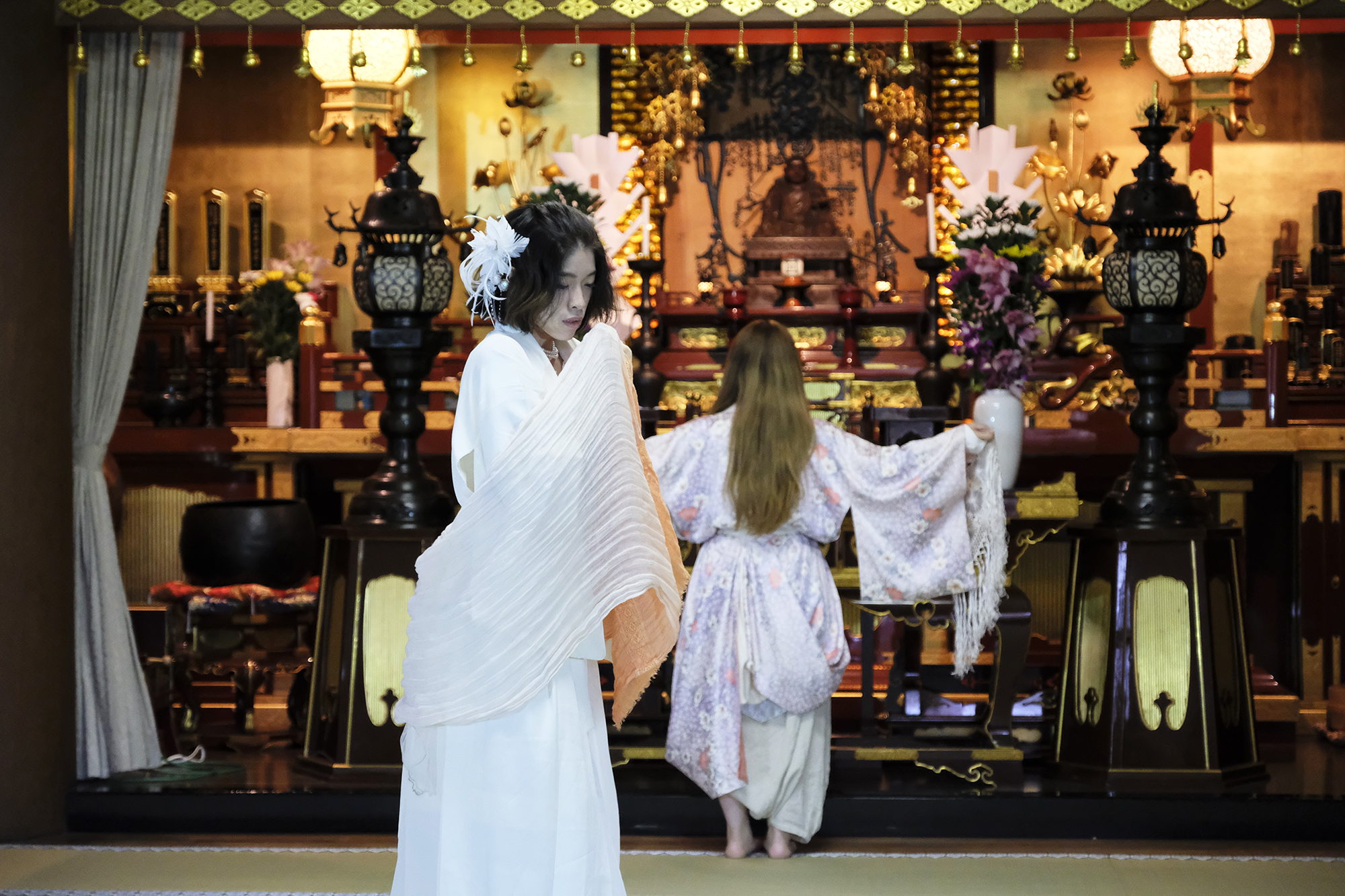 何回か体験してくれている可愛らしいドイツ人女性の方が、今日もモデルさんとの事でした。洋服姿も見てしまうと、お着物を着た時の美しさのギャップがまた素敵ですね!お着物を着てパフォーマンスの準備を整えています。