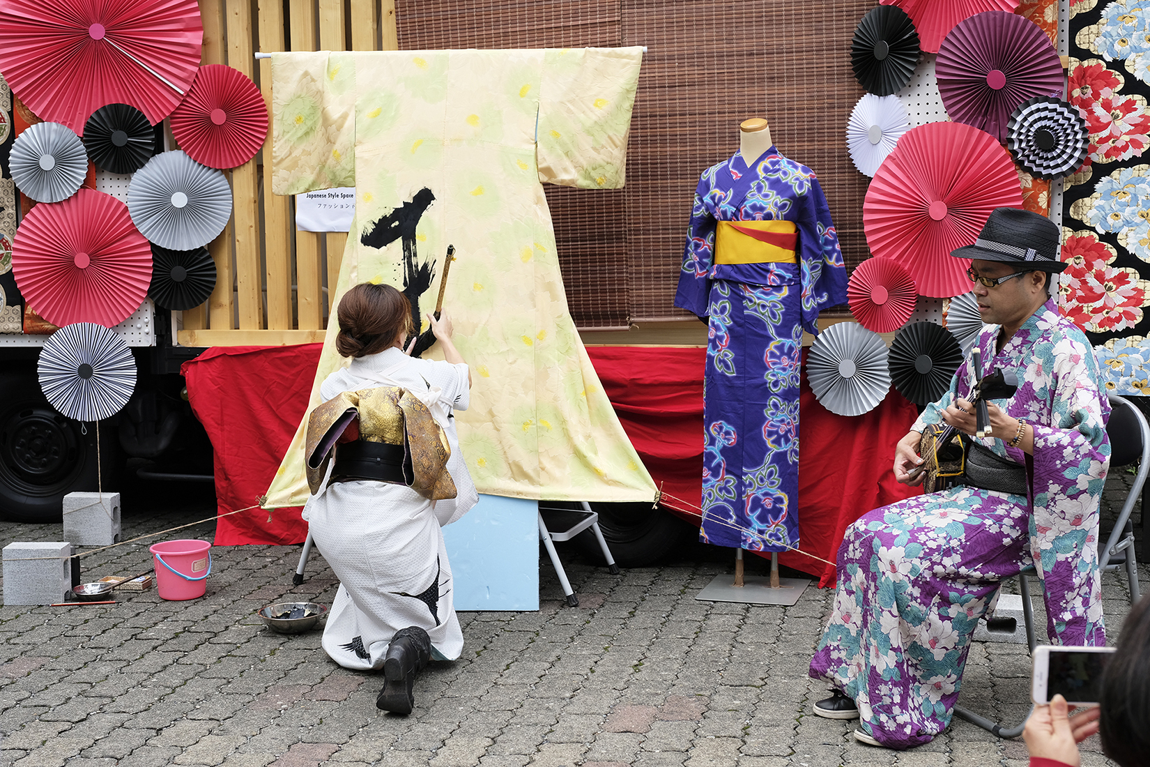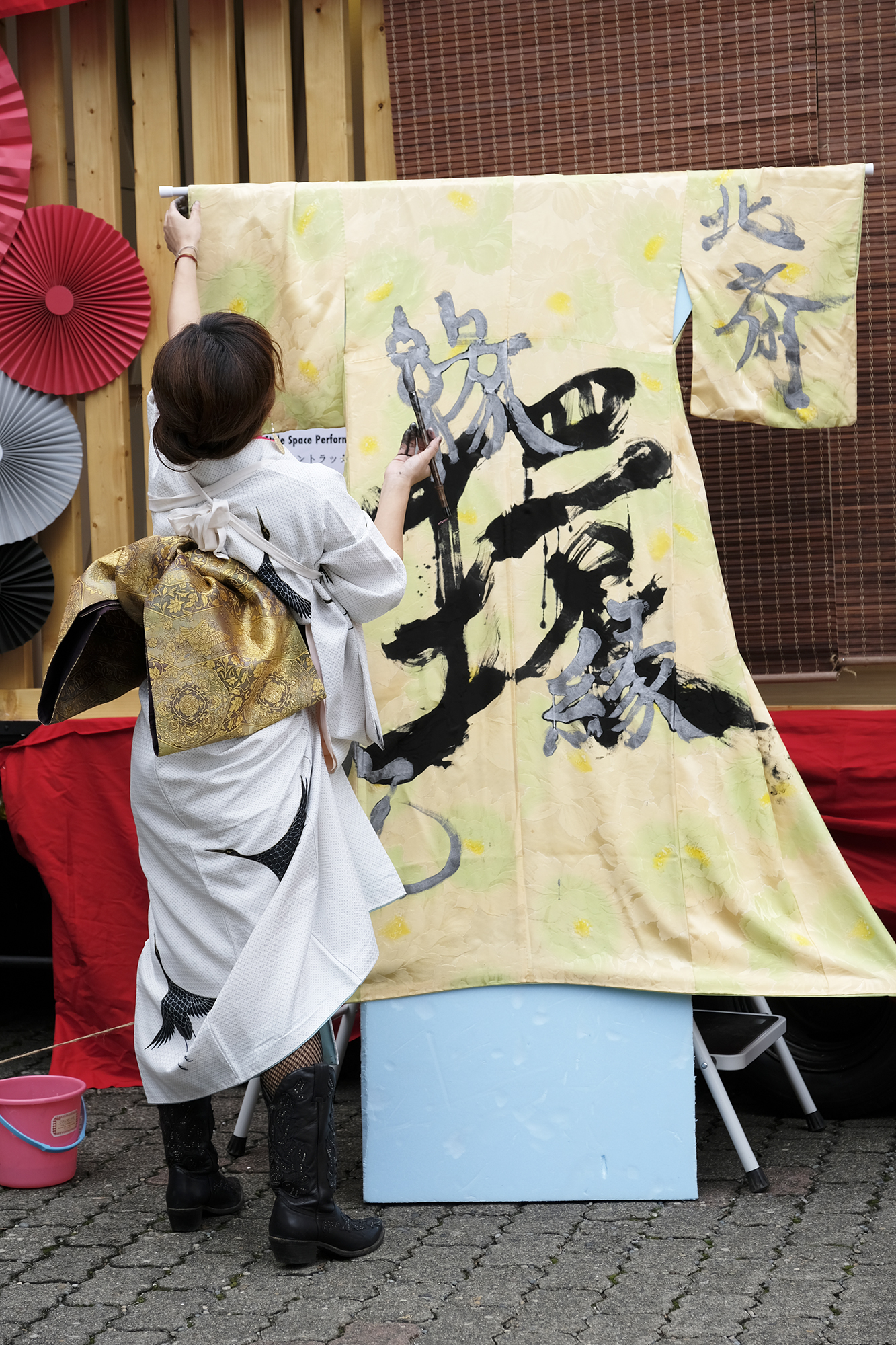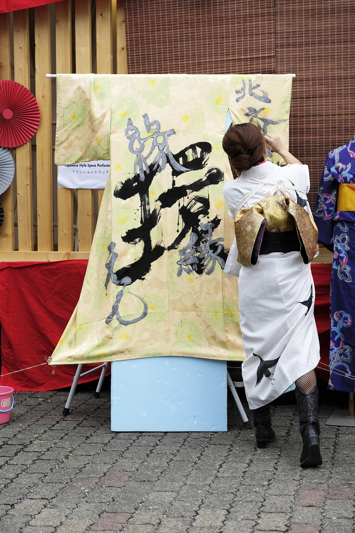 書道家 永島 美織さんと唄/三線 タケシィさんによる、着物をキャンバスにしたライブ書道が、髪結いの後屋外にて行われました。