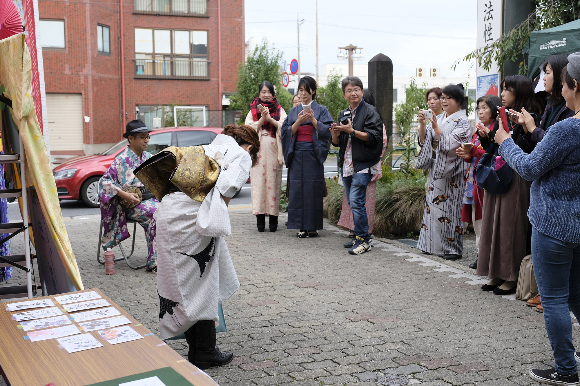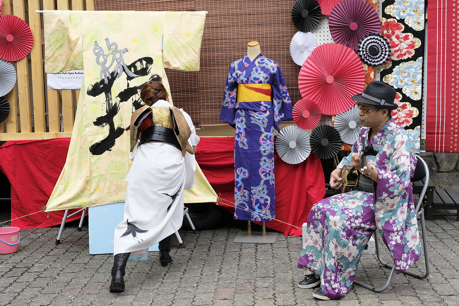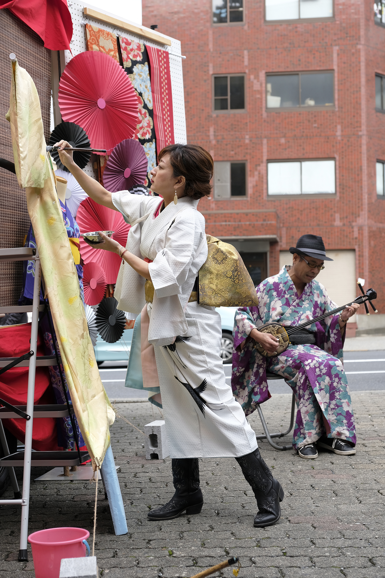 書道家 永島 美織さんと唄/三線 タケシィさんによる、着物をキャンバスにしたライブ書道が、髪結いの後屋外にて行われました。