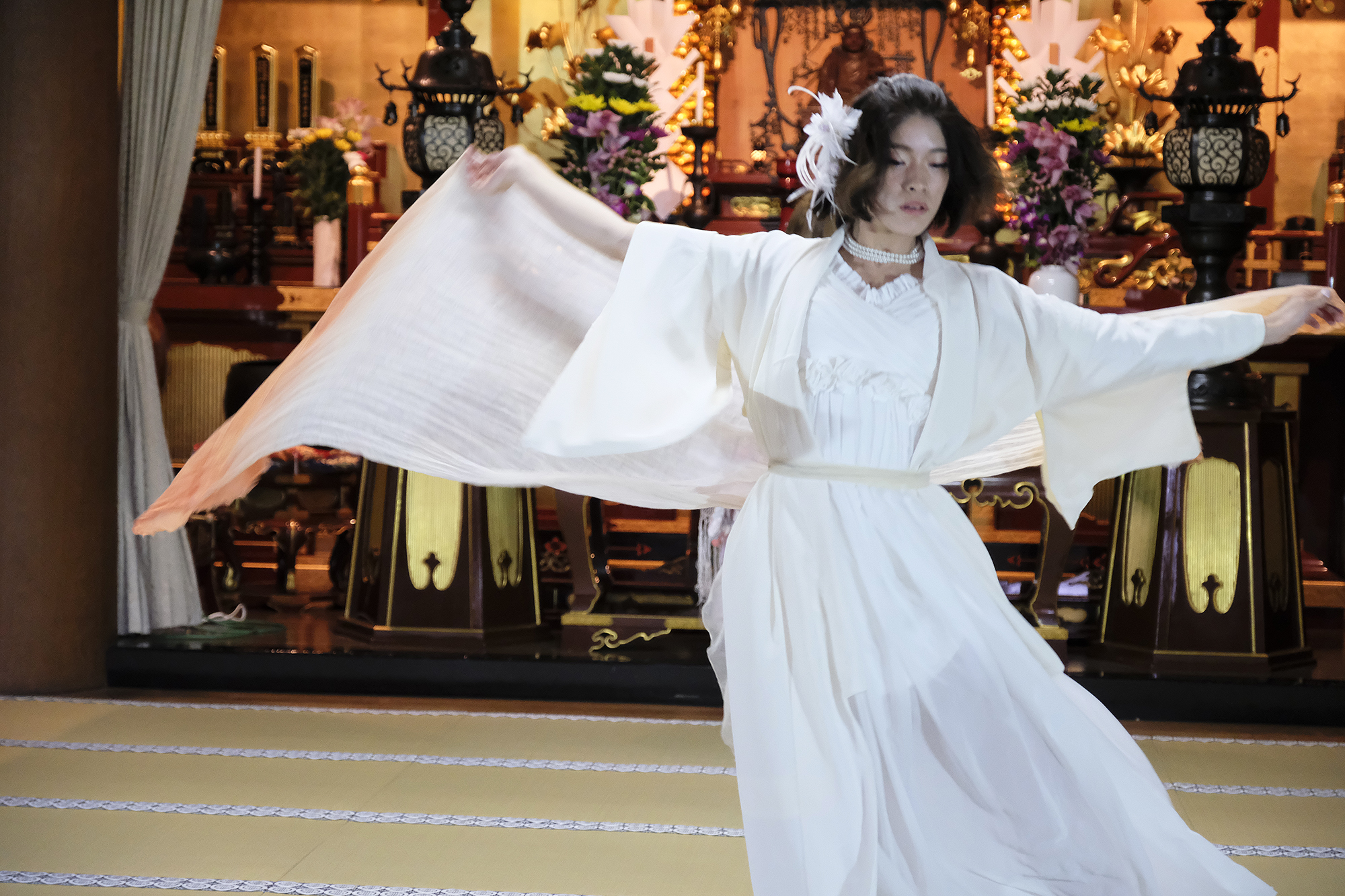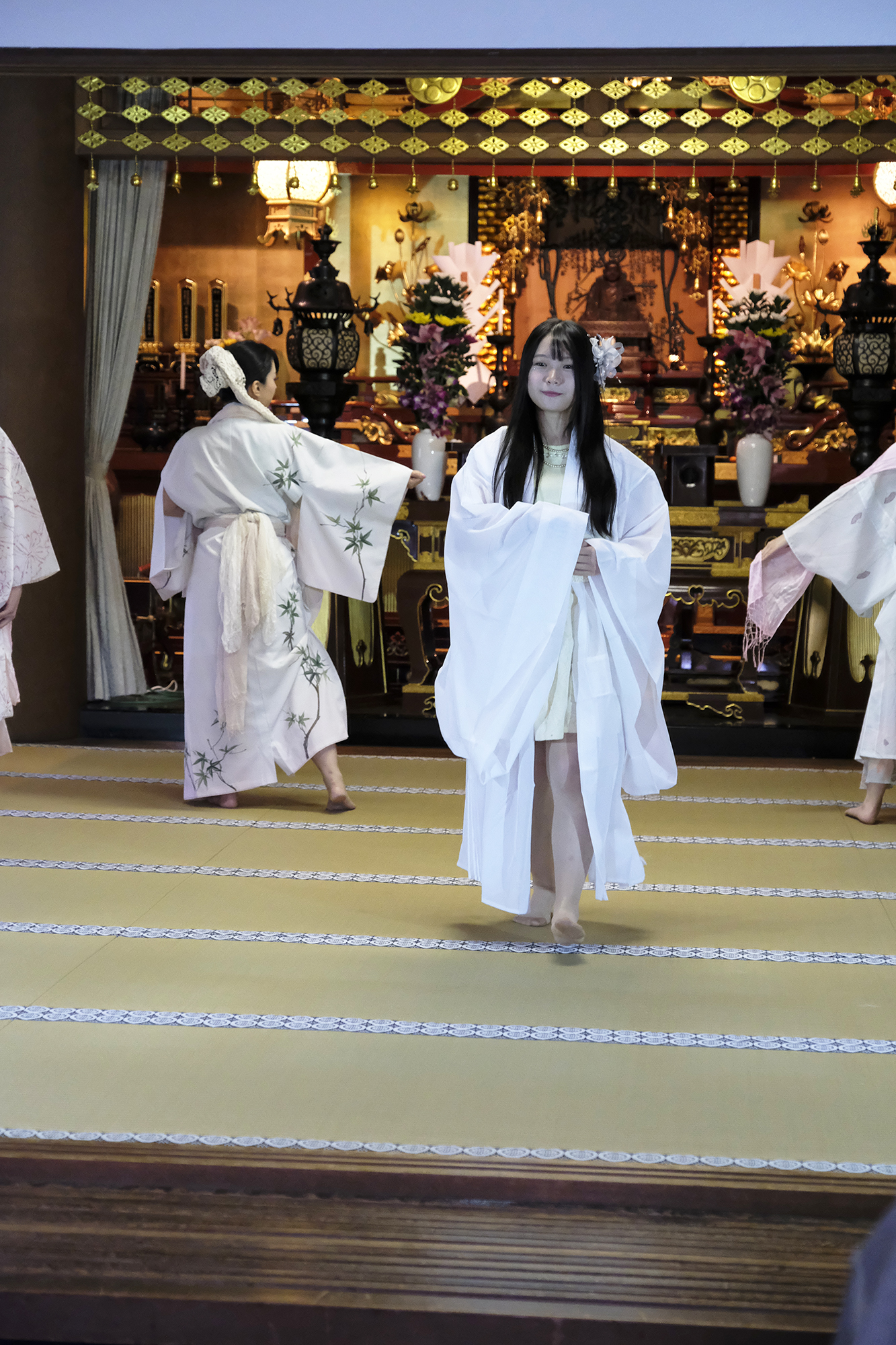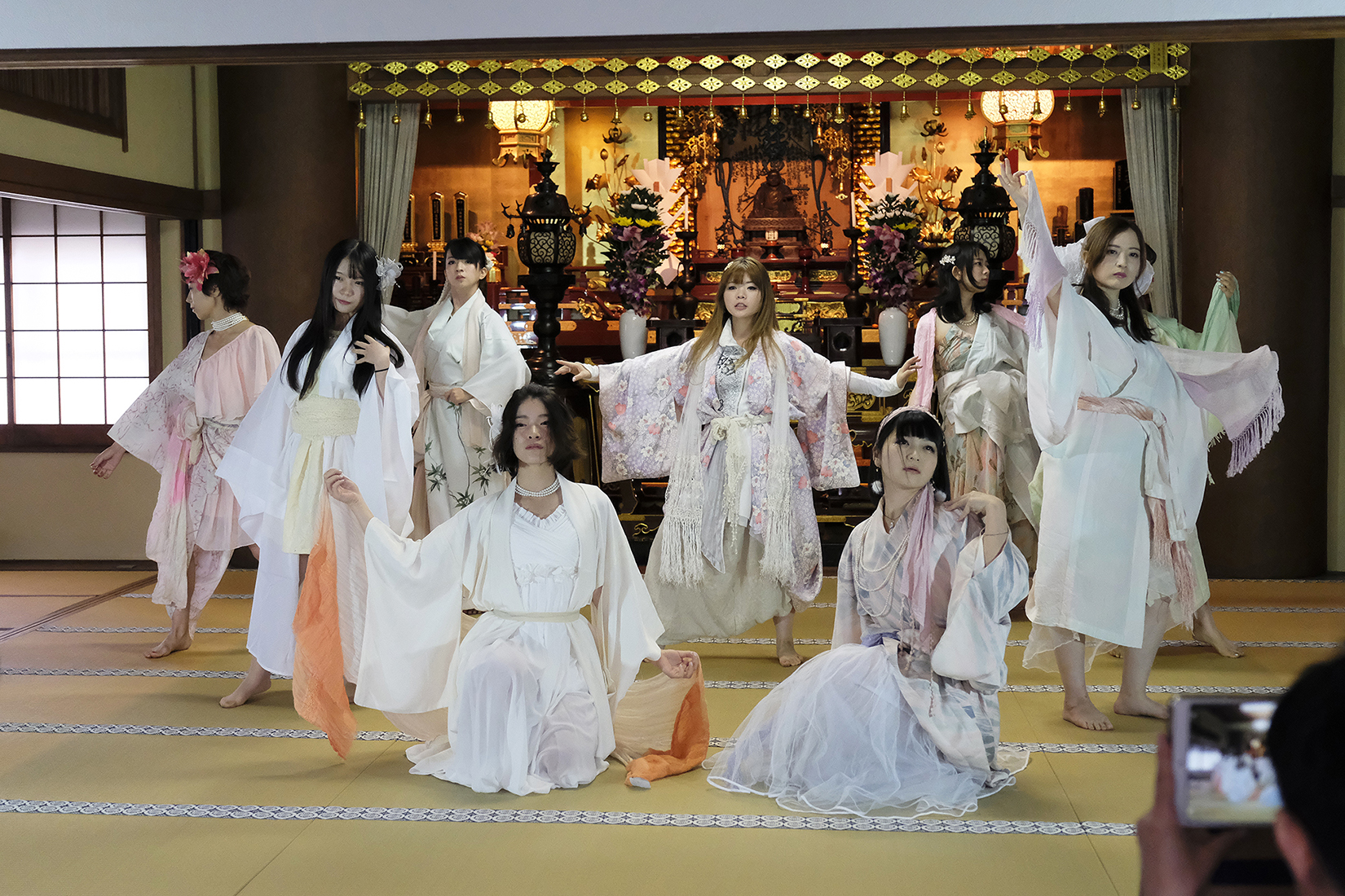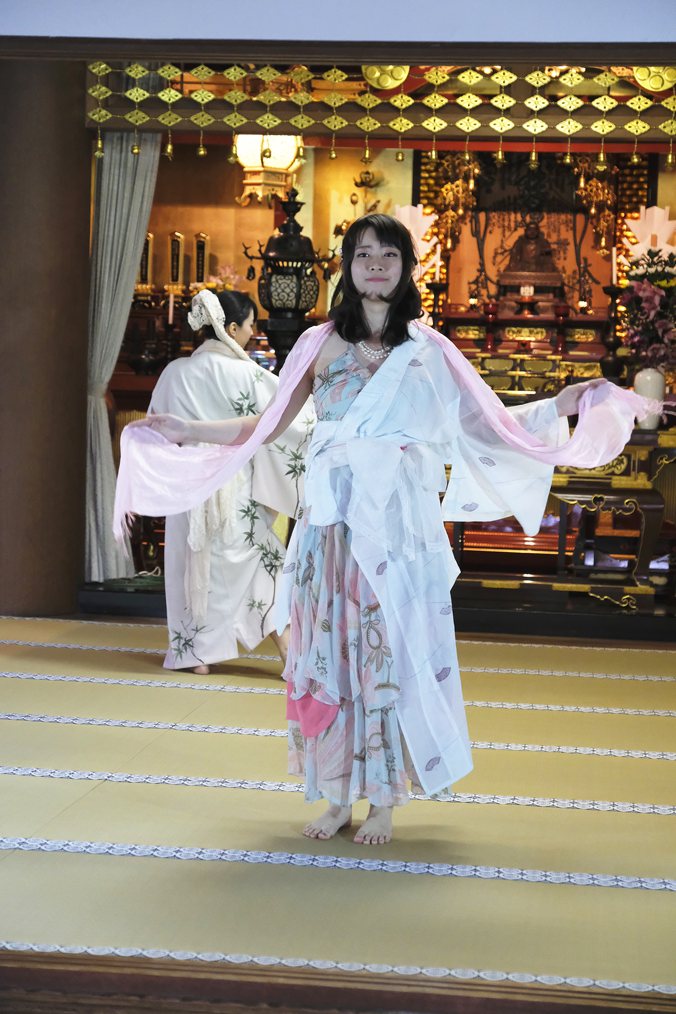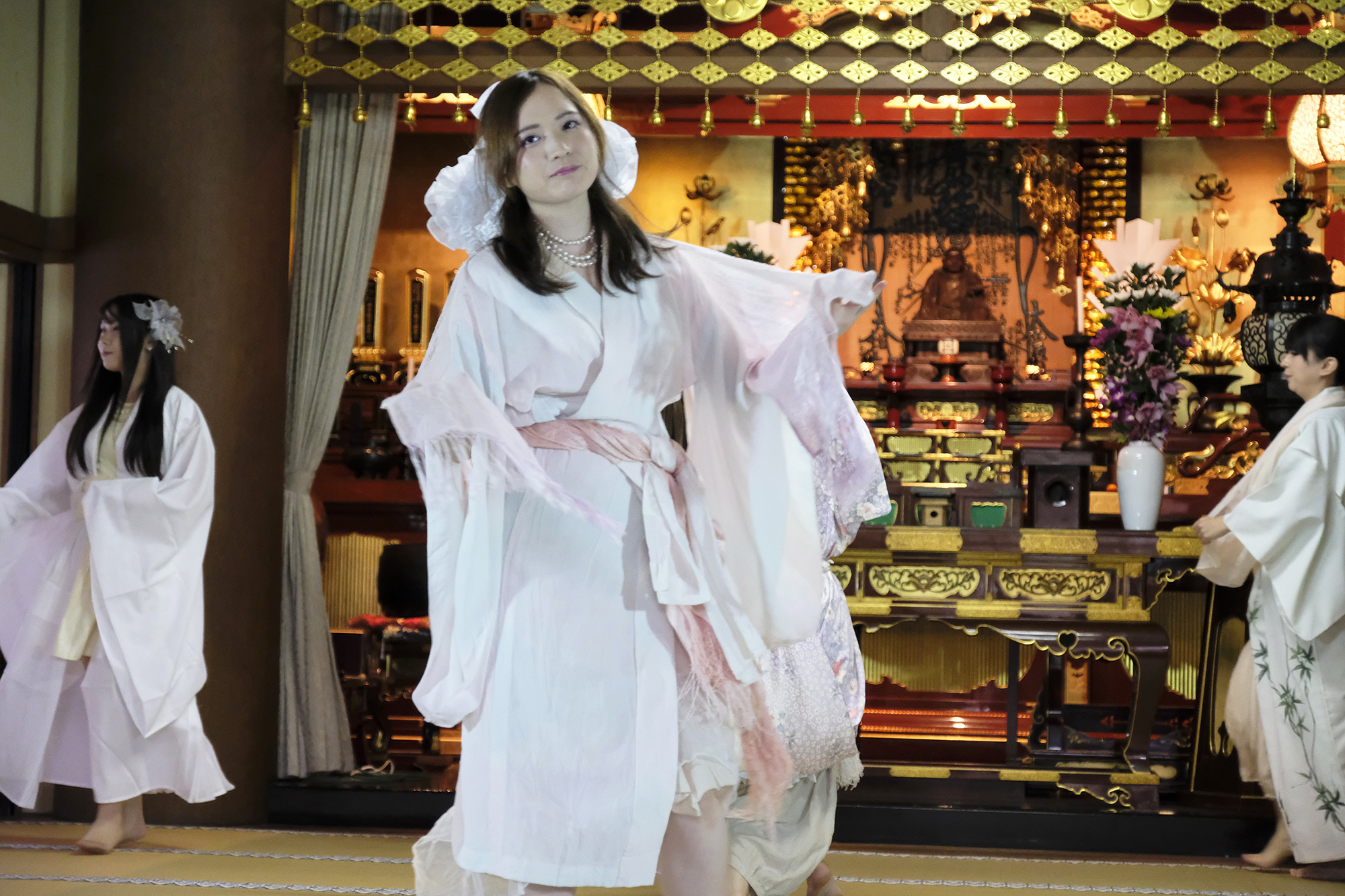 ヨーロッパツアーも廻られているという、兼田玲菜さんの演出の着物パフォーマンス。こちらは全員が真っ白や淡いピンクのとても女の子らしい衣装に身を包み、その衣装も斬新な着物をアレンジしたデザインで、ひらりとひらりとまるで天女の様に舞い踊るパフォーマンス。可愛らしい天女、総勢9名で踊るパフォーマンスは、とても美しく目を奪われます。その美しい舞を次からの写真でお楽しみください。