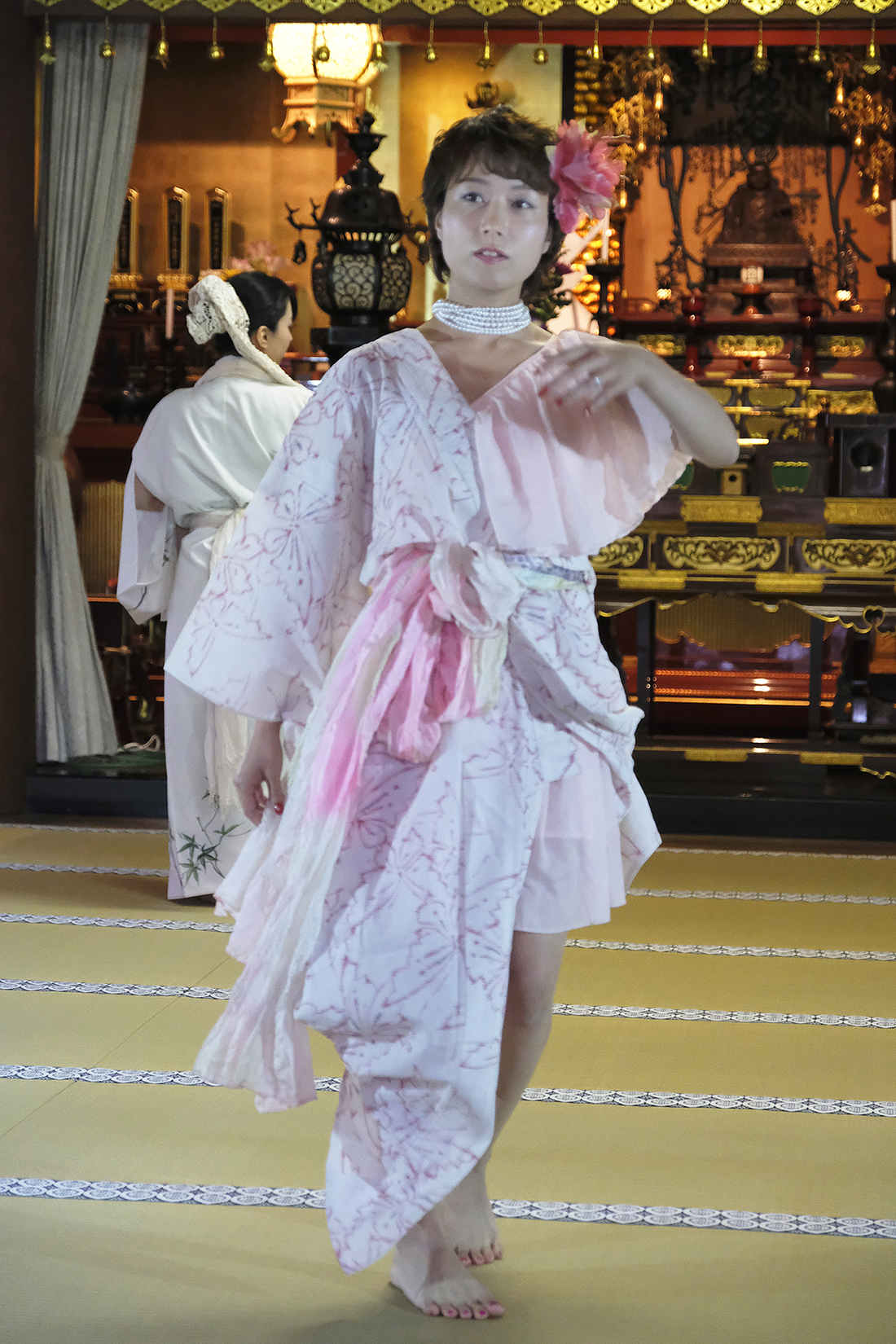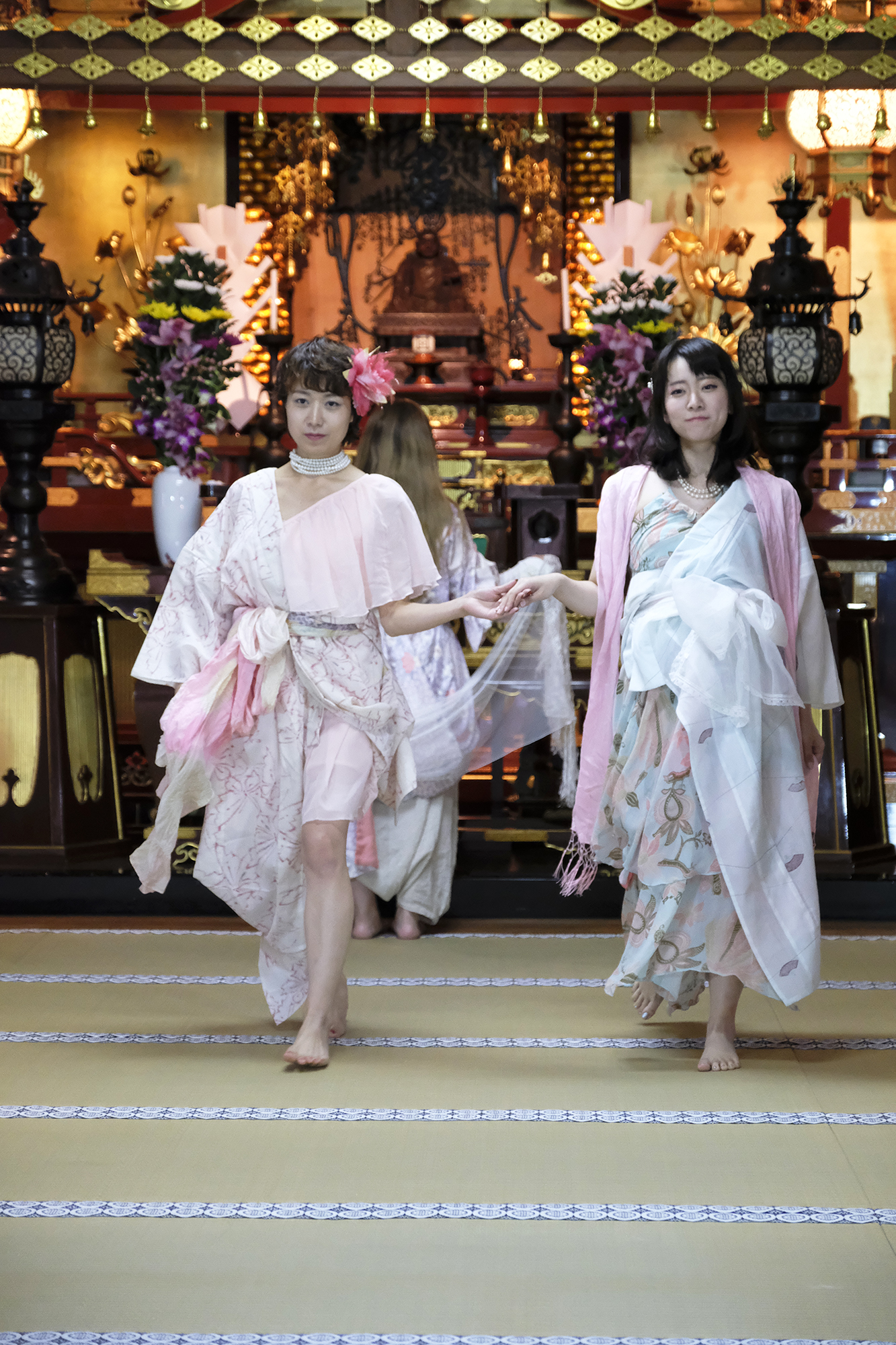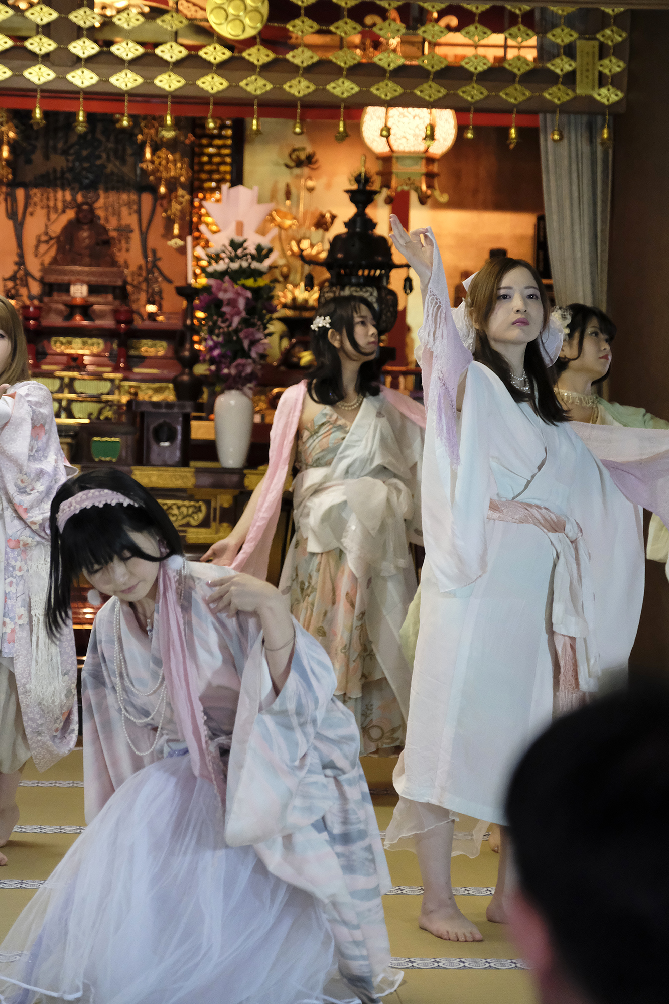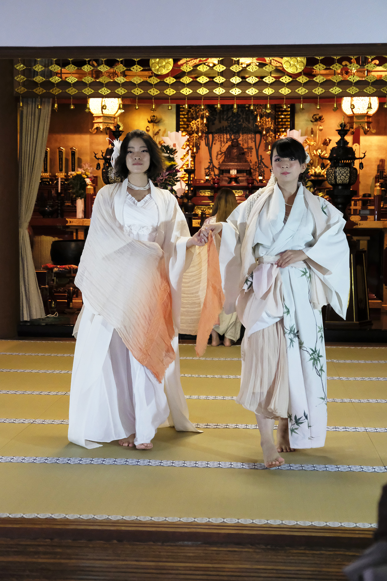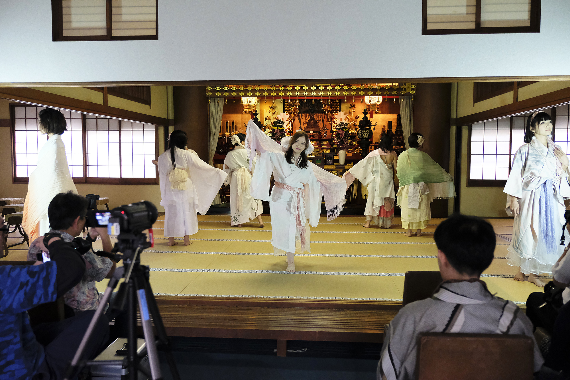 ヨーロッパツアーも廻られているという、兼田玲菜さんの演出の着物パフォーマンス。こちらは全員が真っ白や淡いピンクのとても女の子らしい衣装に身を包み、その衣装も斬新な着物をアレンジしたデザインで、ひらりとひらりとまるで天女の様に舞い踊るパフォーマンス。可愛らしい天女、総勢9名で踊るパフォーマンスは、とても美しく目を奪われます。その美しい舞を次からの写真でお楽しみください。