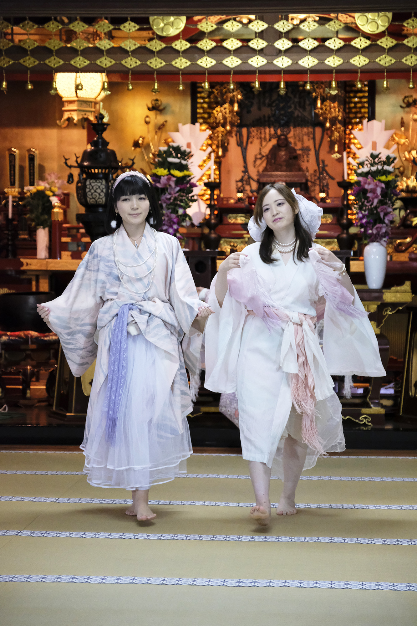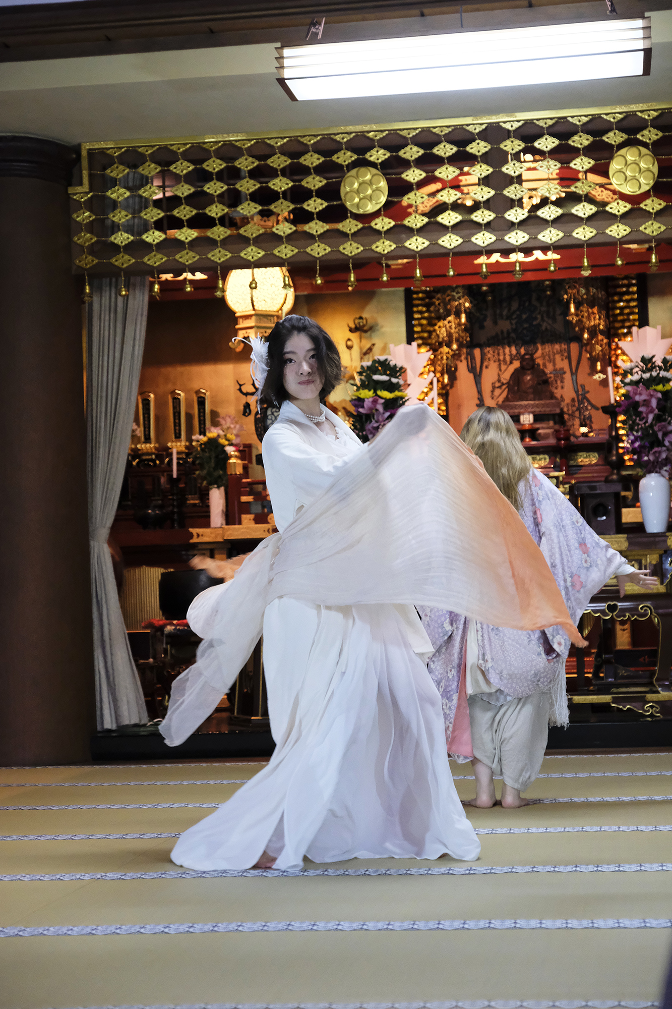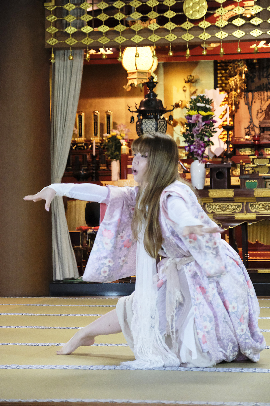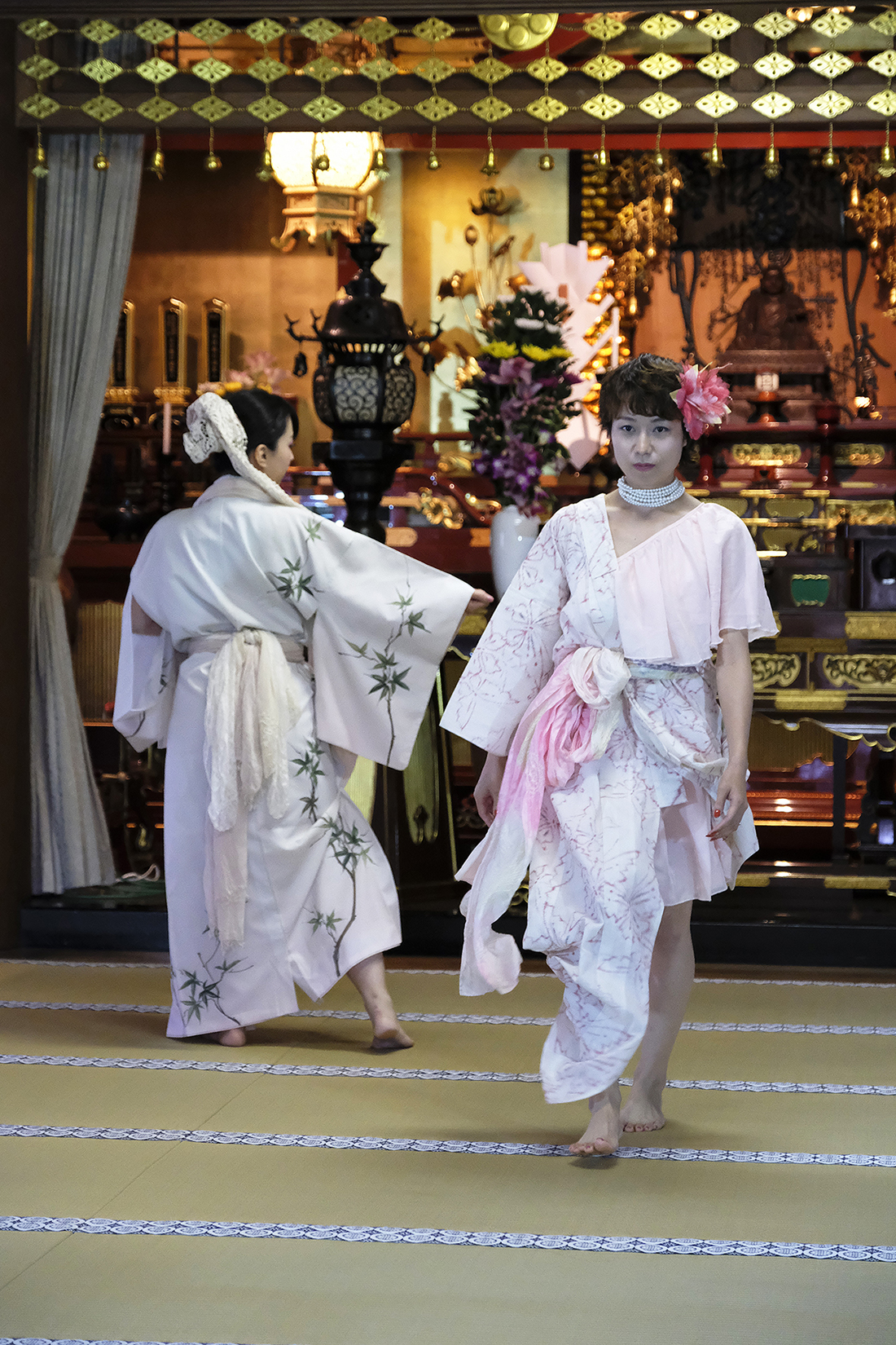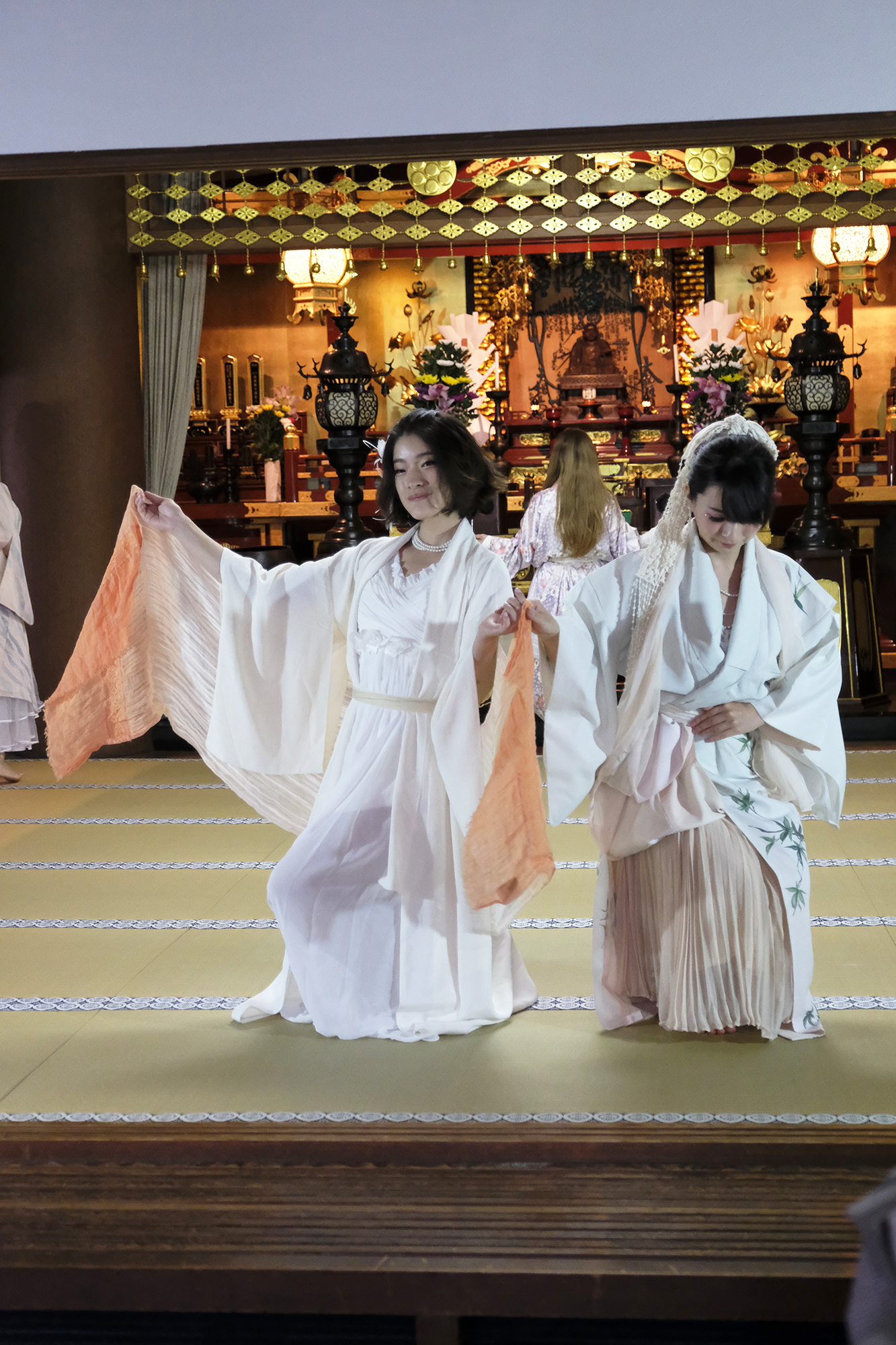 ヨーロッパツアーも廻られているという、兼田玲菜さんの演出の着物パフォーマンス。こちらは全員が真っ白や淡いピンクのとても女の子らしい衣装に身を包み、その衣装も斬新な着物をアレンジしたデザインで、ひらりとひらりとまるで天女の様に舞い踊るパフォーマンス。可愛らしい天女、総勢9名で踊るパフォーマンスは、とても美しく目を奪われます。その美しい舞を次からの写真でお楽しみください。