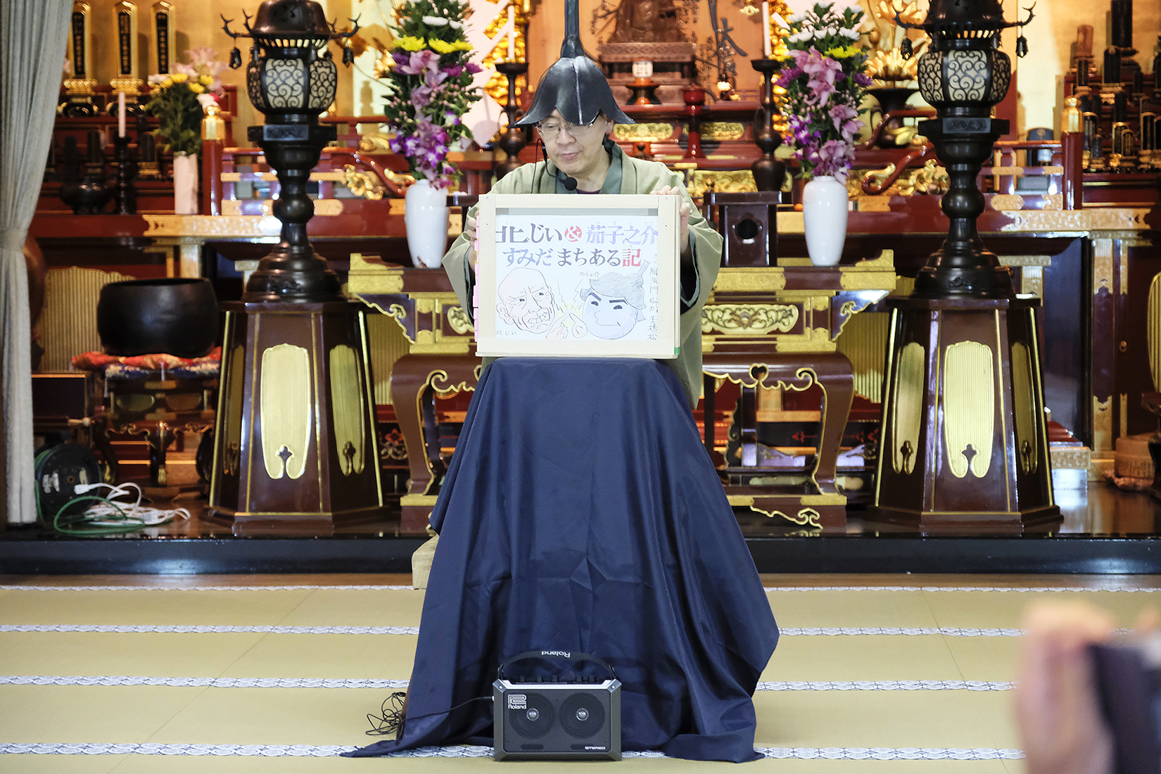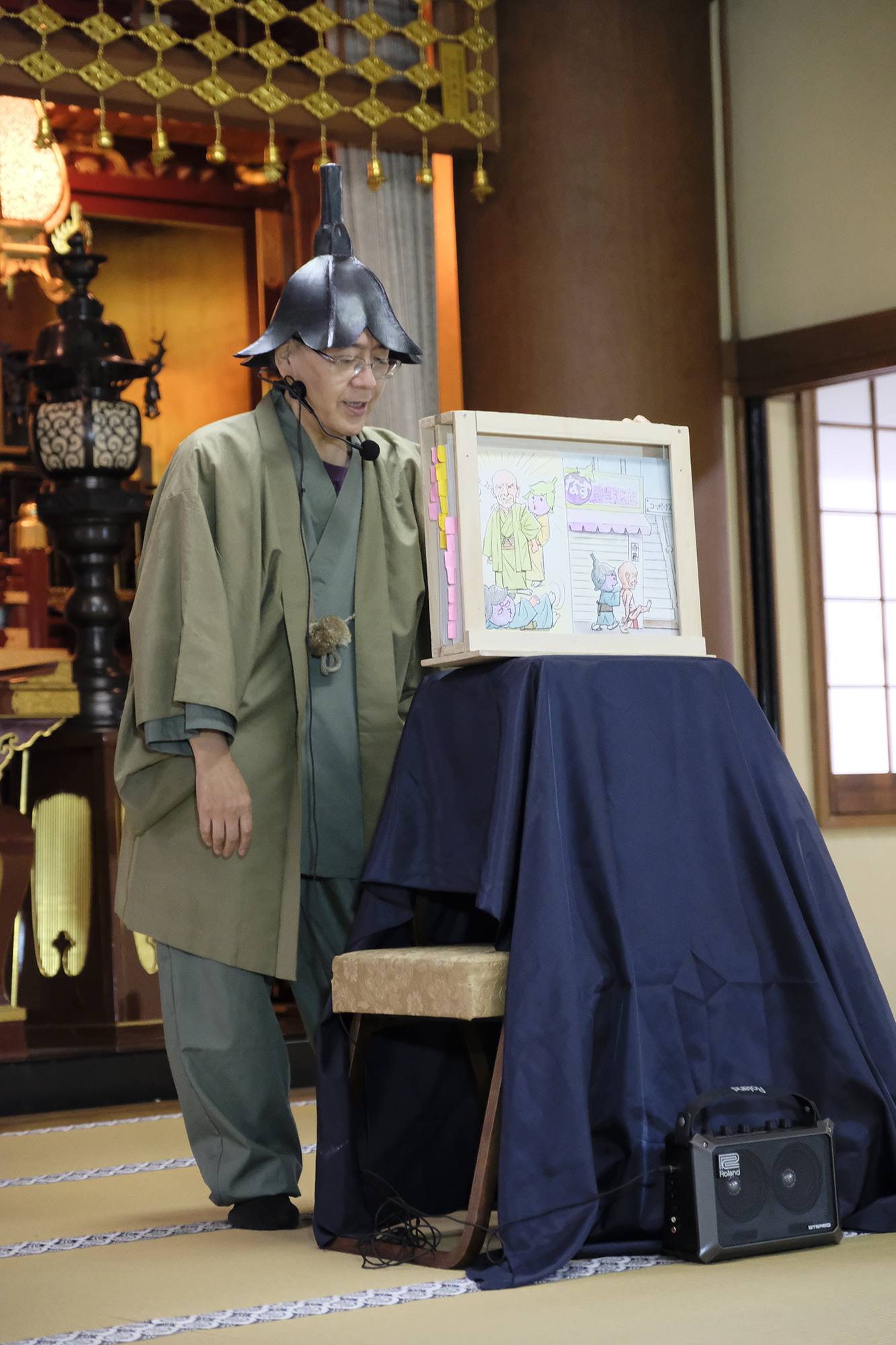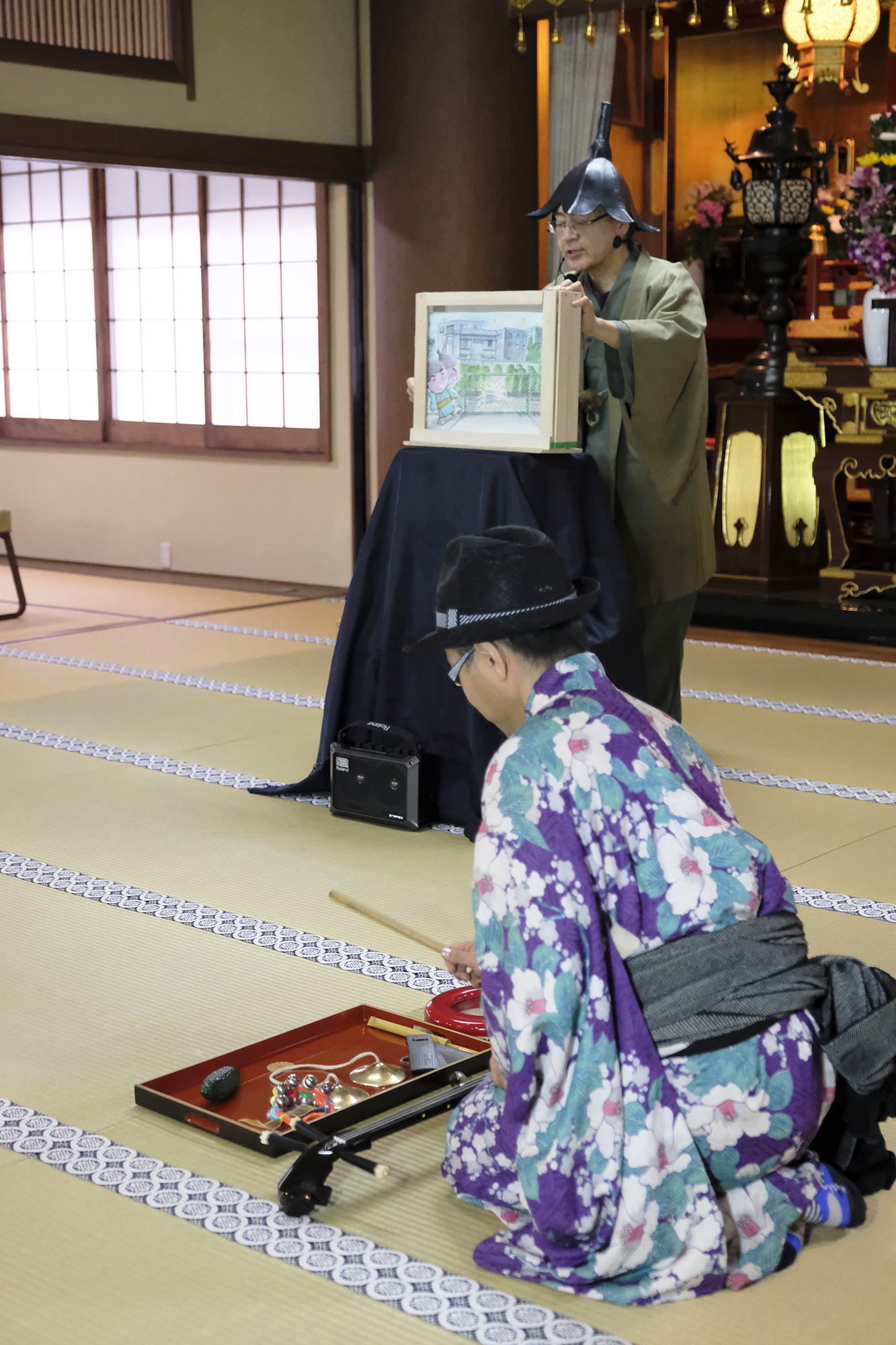 そして次はこの辺り葛飾では有名な、茄子爺こと田村風來門さんによる”北じぃ&茄子之介すみだまちある記”の紙芝居。その名の通り、茄子の帽子を被り、茄子のへたの様な色の御着物姿の田村風來門さん!