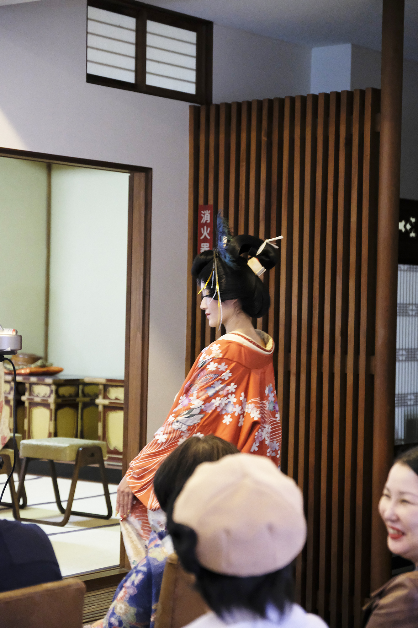 そして、お昼が近くなった頃、お座敷の中央程で皆様に見守られながら髪結いパフォーマンスが始まりました。完成した美しいモデルさんに、皆様目が釘付けでした!